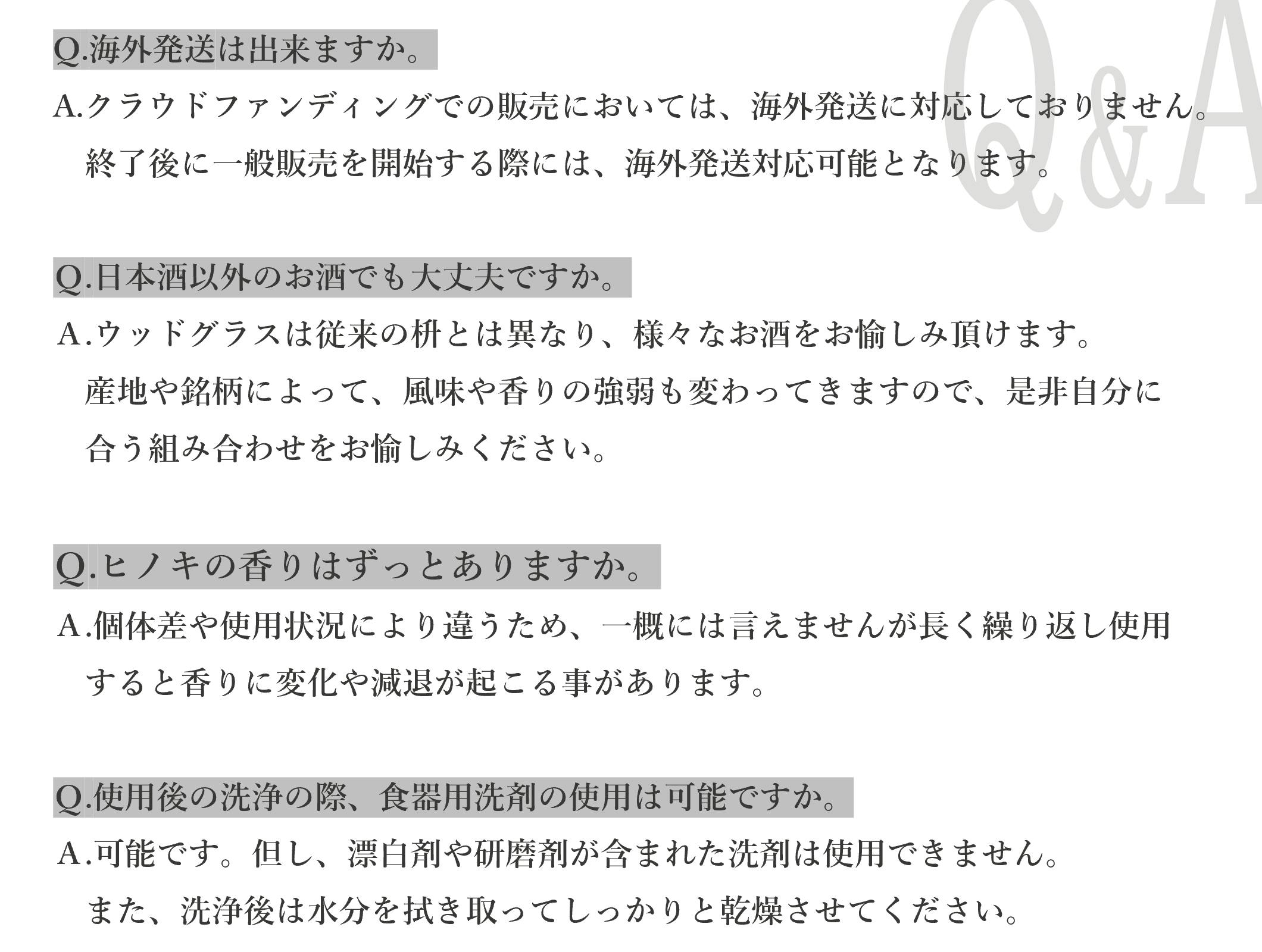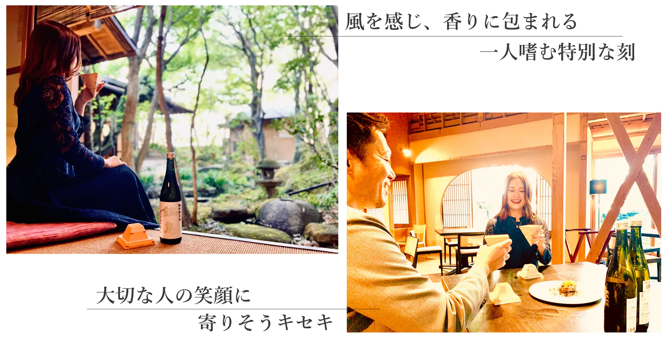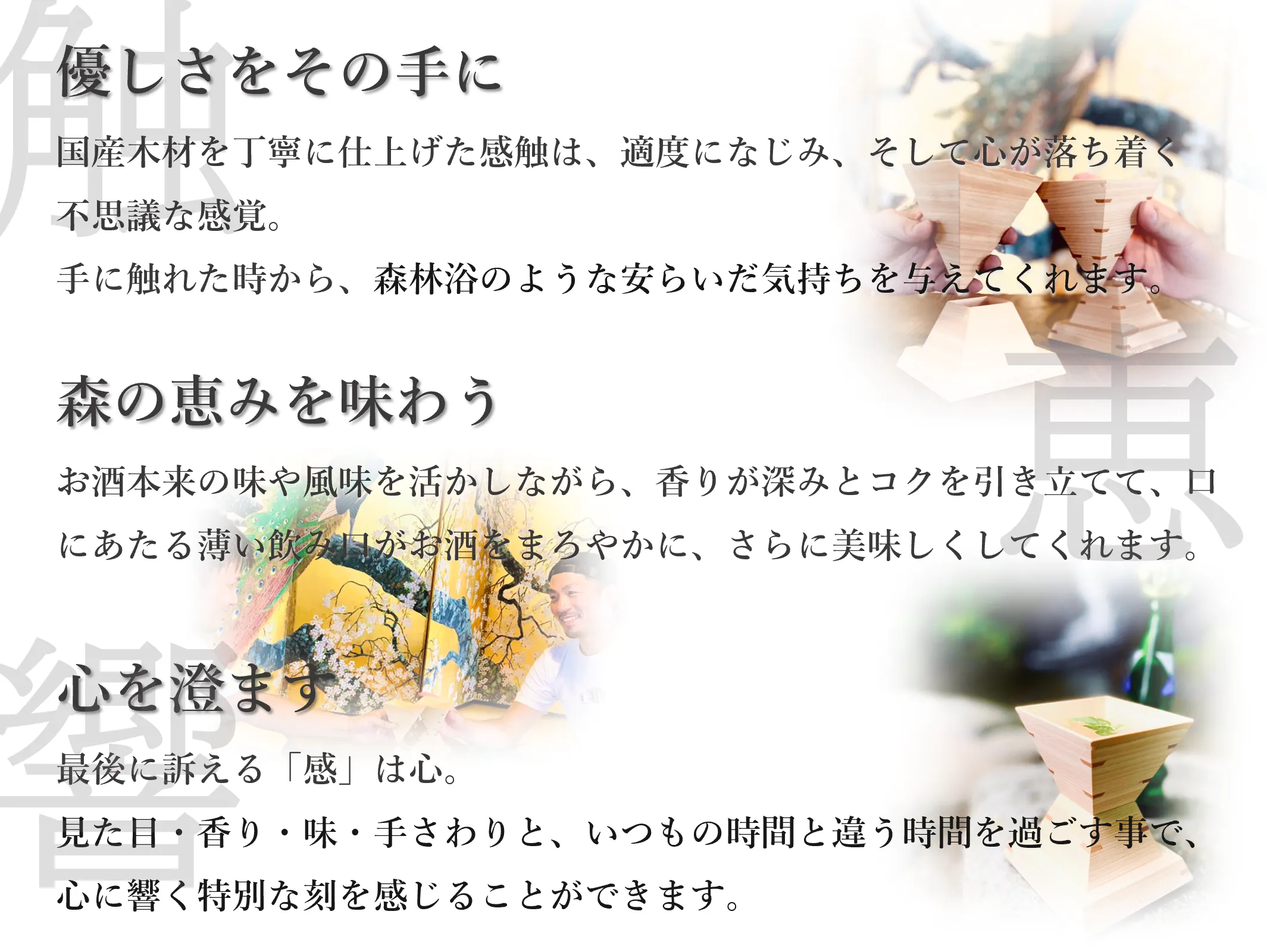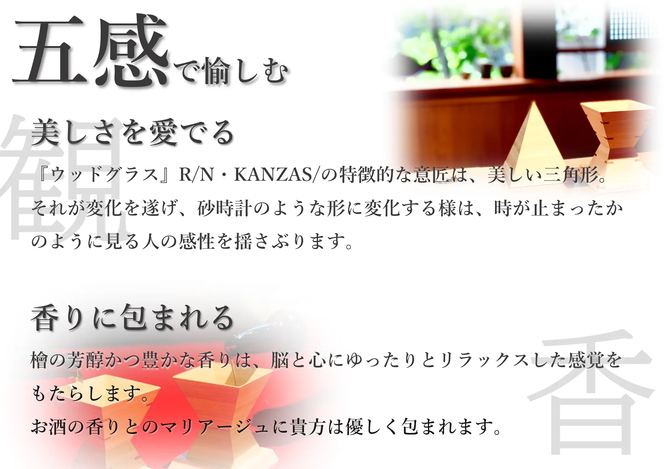 ウッドグラスは、ガラス製・金属製のグラスや陶器とは違い、自然素材であるヒノキの芳醇な香りと木の優しい感触で、これまでとは違うお酒の美味しさを生み出します。見た瞬間、触った瞬間、口に当てた瞬間に「五感」を刺激して、心に訴えかけてくる特別な器です。燗付けでは無く、「感」付けをお愉しみください。