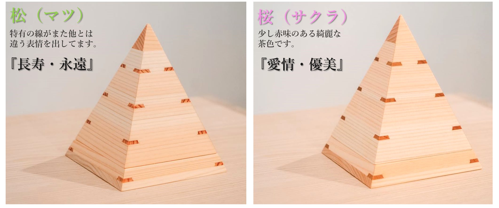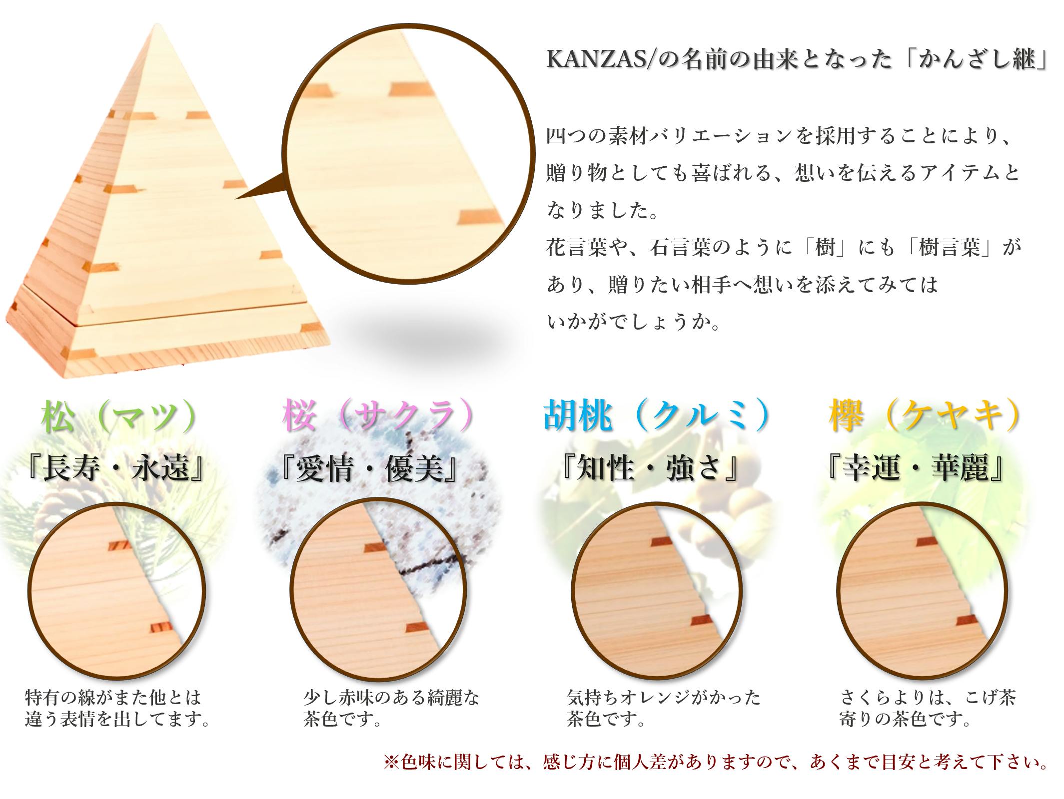 このかんざし継の素材は「松」「桜」「胡桃」「欅」と4つのパターンを採用し、その一つ一つに「樹言葉」を込めて、大切な方への贈り物や自分自身へのご褒美にも最適です。