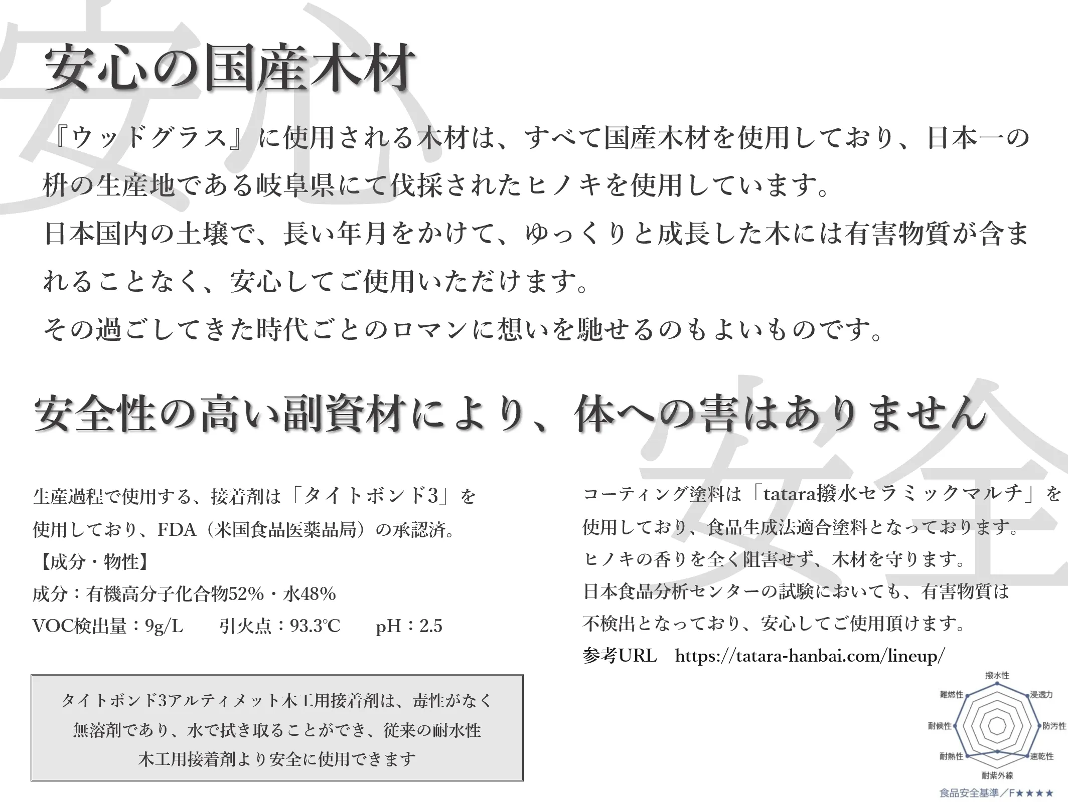 ウッドグラスに使用される木材は、全て国産木材で、生産も全て国内となります。確かな腕を持つ職人の手により、ひとつひとつ丁寧に丹精込めて作られており、使用している接着剤や素材を守るコーティング塗料も安全基準をクリアしたものを使用しており、安心してご使用頂けます。
