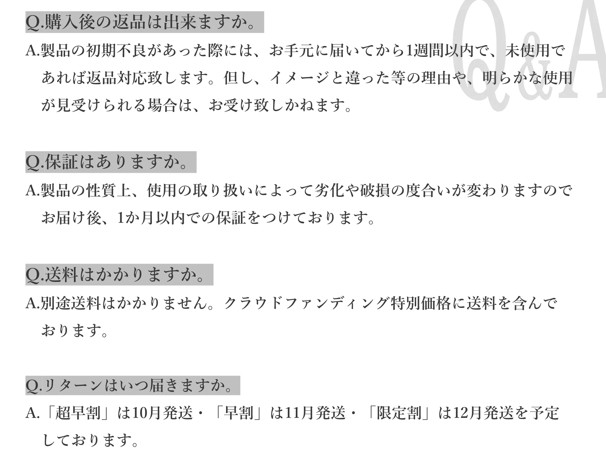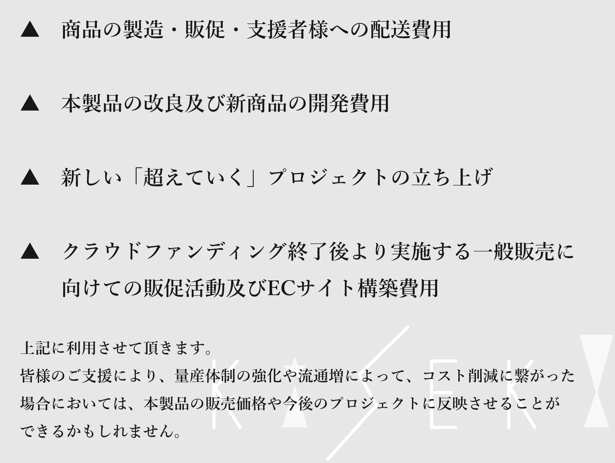 ・本プロジェクトにおいて想定を上回るご支援を頂いた場合、製品の製造における量産体制を整えることが出来ましたら、正規販売価格を現予定価格よりも下げる可能性もございます。