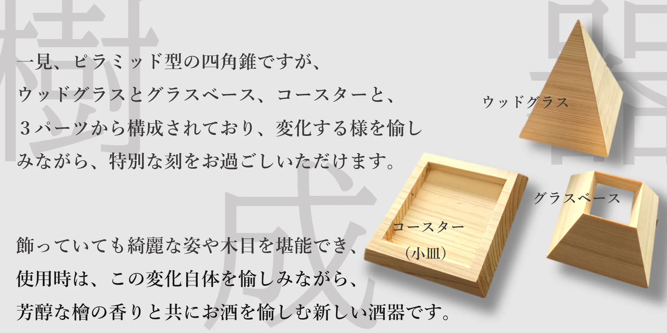 今回のプロジェクトは、お酒を愛する全ての人へ、新しいお酒の時間を生み出すために、そして日本の伝統的な良いものを国内外へ向けて、改めて発信する為にあまり体験する機会の無い「枡でお酒を愉しむ」新たな酒器の開発を行いました。 「食」をテーマに開発したウッドグラスは、これまでに見たことのない、体験したことのない感動に出逢えます。