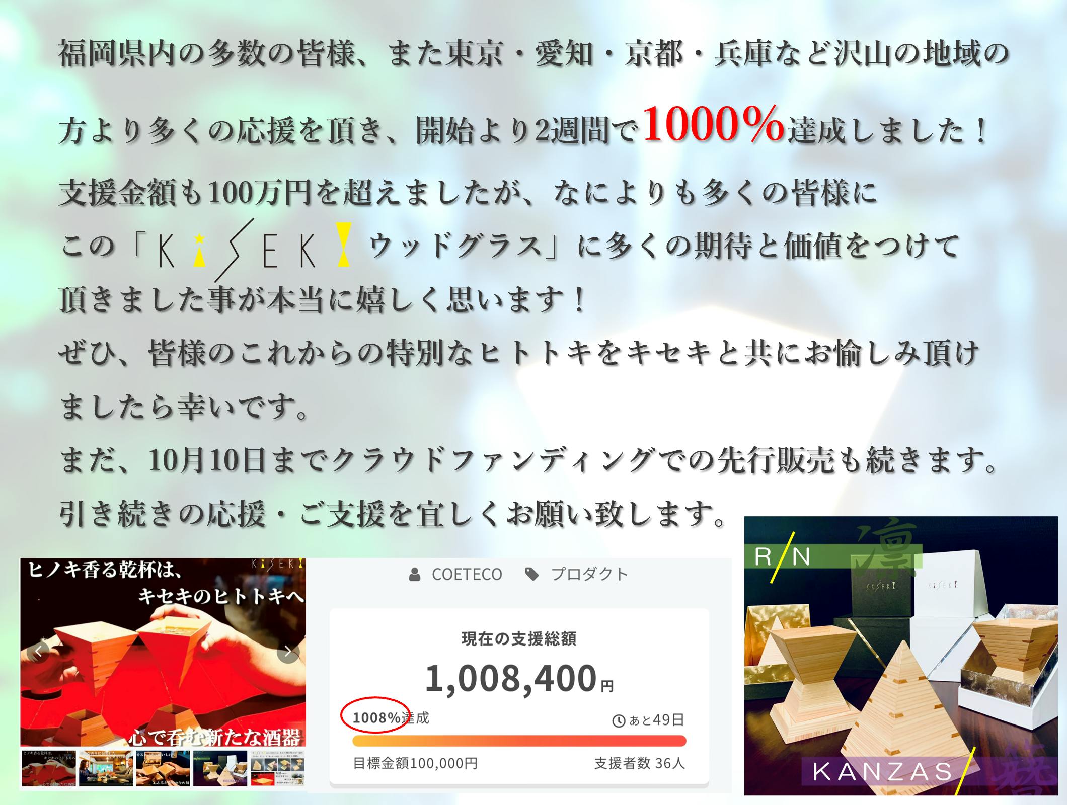 2022/08/22 18:148月8日よりスタートしまして、今日8月22日でちょうど2週間がたちました。支援者の皆様の温かい応援で今日、目標1000%を達成する事が出来ました!!ご支援頂きました皆様、本当に有難うございます!そして、とても嬉しい心震えるメッセージを頂きました。「商品を見て、心が動きました」まさにこの感動をもたらす事が我々COE⇧ECOのプロダクトの使命です。この言葉に私たちも、更なる勇気と力を頂きました!より多くの皆様に、いつもの時間をキセキのようなヒトトキに変えるこの今までにない酒器を体感頂けますように、現在はご支援者100人を目指しております。商品の箱や梱包を含めた全てのカタチが「KiSEKI」の商品です。箱も最終パッケージが完成しましたので、こちらも追って報告致します。10月10日まで先行販売は続きますので、皆様の温かい応援を引き続き宜しくお願い致します。 もっと見る