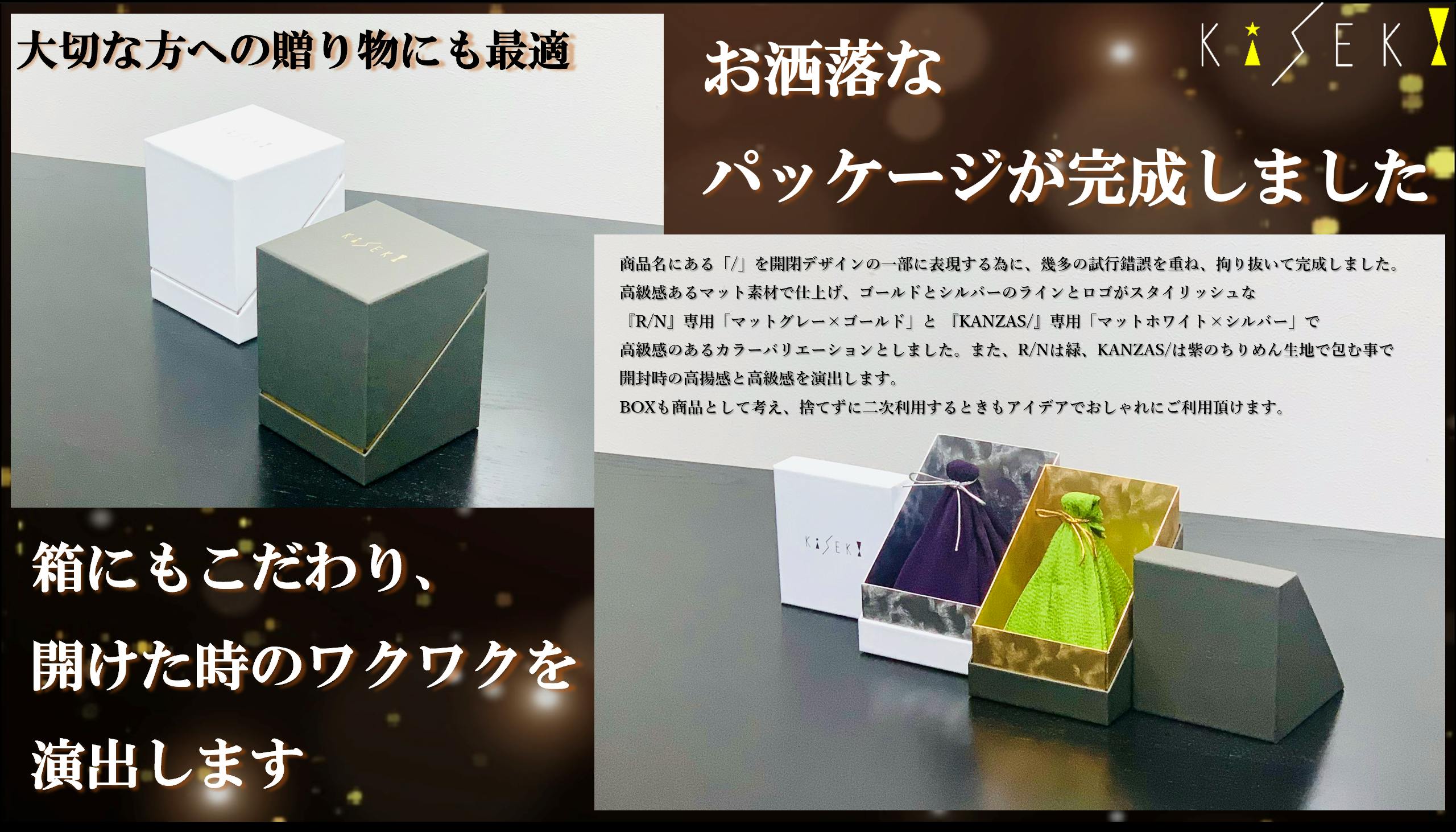 2022/09/03 20:50こだわり抜いたデザイン『KiSEKI』シリーズの商品名には全てに「/(アイ)」があります。この「/」を箱のデザインの一部に表現する為に、幾多の試行錯誤を重ね、拘り抜いて完成しました。高級感あるマット素材で仕上げ、ゴールドとシルバーのラインとロゴがスタイリッシュな『R/N』専用「マットグレー×ゴールド」と 『KANZAS/』専用「マットホワイト×シルバー」で高級感のあるカラーバリエーションとしました。また、R/Nは緑、KANZAS/は紫のちりめん生地で包む事で開封時の高揚感と高級感を演出します。『KiSEKI』シリーズはBOXも商品として考え、捨てずに二次利用するときもアイデアでおしゃれにご利用頂けます。贈り物に最適「高級感」と「高揚感」を演出するデザインと仕様で贈り物に最適です。ウッドグラスに対面する前からワクワクする事で、より印象強い感動を演出できます。贈った方も贈られた方も幸せな刻を過ごして頂けると幸いです。 もっと見る