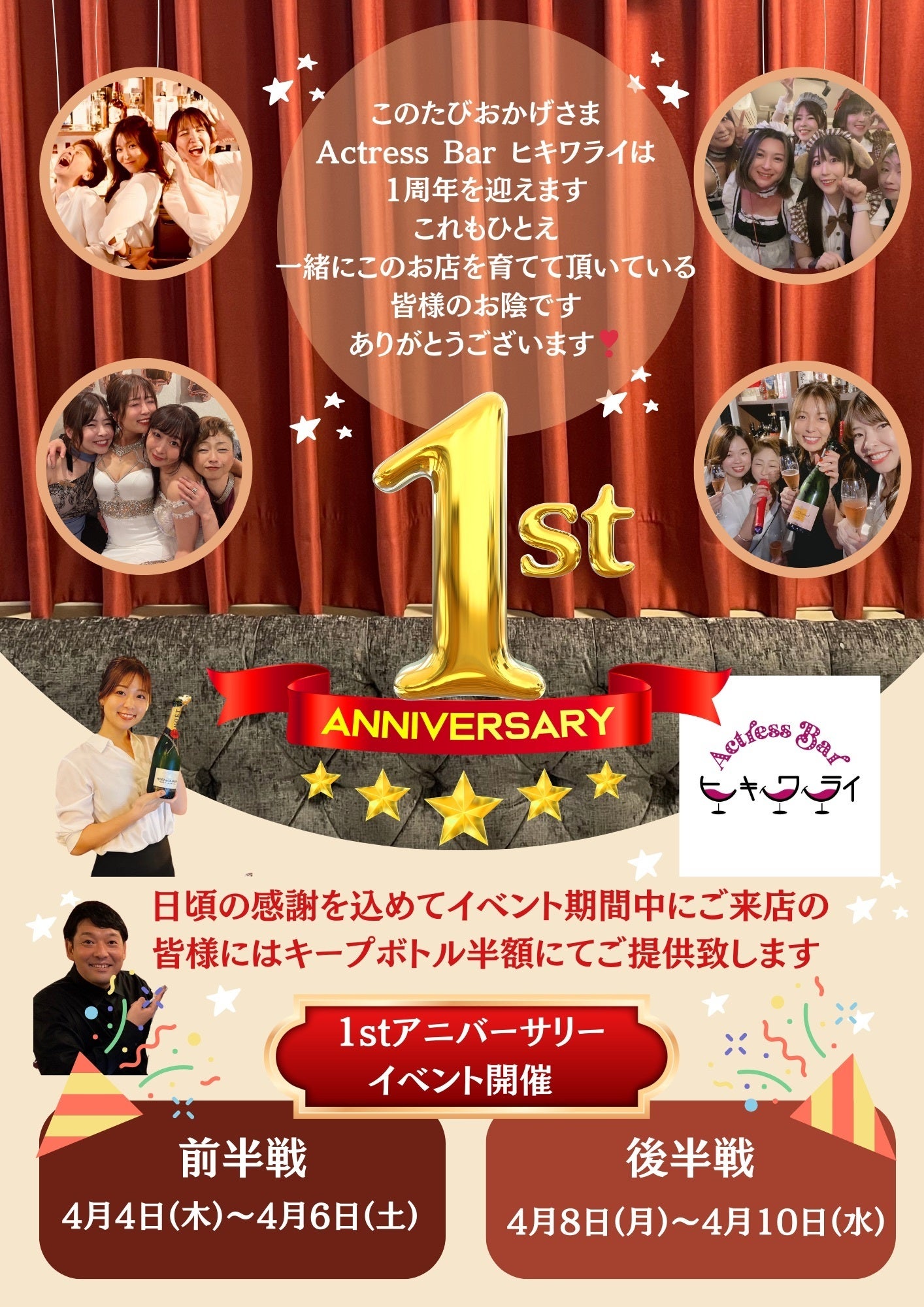新宿三丁目ActressBarヒキワライのクラウドファンディングにご支援くださった皆様へ今月4月6日にActressBarヒキワライは1周年を迎えることができました。あのクラファンから一年ちょっと!あっという間だったけど、あまりにも密度の濃い時間が過ぎてゆき、まだ一年なんだなぁと言う気持ちもあります。クラウドファンディングに支援と言う方で背中を押してくださった皆様には感謝しかありません。今は、お店を立てて良かったと心から思う日々です。本当にありがとうございます。この一年で、ヒキワライのキャストはオーナー陣含めて総勢16人になりました。まだまだ至らない点もあるかとは思いますが、お店が今よりももっと楽しく、居心地の良い空間になるよう考えてキャスト一同日々精進してます!これからも新宿にはヒキワライがある!と言って貰えるようなお店を目指して、末永く愛されるお店を作って行きます。今後ともご贔屓に何卒宜しくお願いします!いつでもお店でお待ちしてます(^ ^)ActressBarヒキワライ一同ActressBarヒキワライ1600022 東京都新宿区新宿三丁目11-6エクレ新宿307月〜金Open20時~Close25時土・祝日Open19時~Close25時日曜定休日https://pont.co/u/ab_hikiwarai《飲み放題オッケーカラオケ無料歌いたい放題カウンター10席ボックス17席》