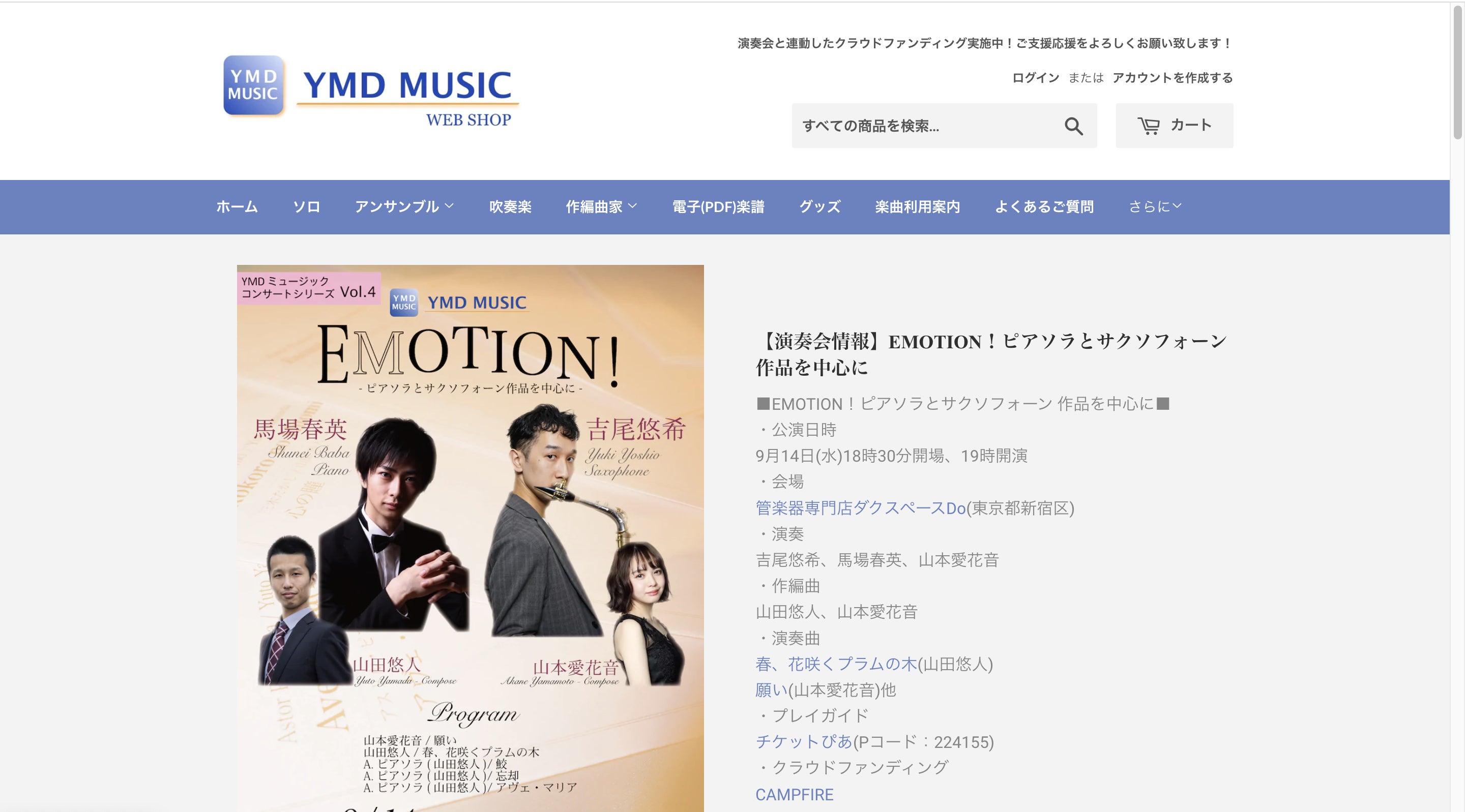2022年9月14日開催「EMOTION!ピアソラとサクソフォーン作品を中心に」で演奏するYMDミュージック出版作品の楽譜セットです。通常よりお得に手に入れることができます。