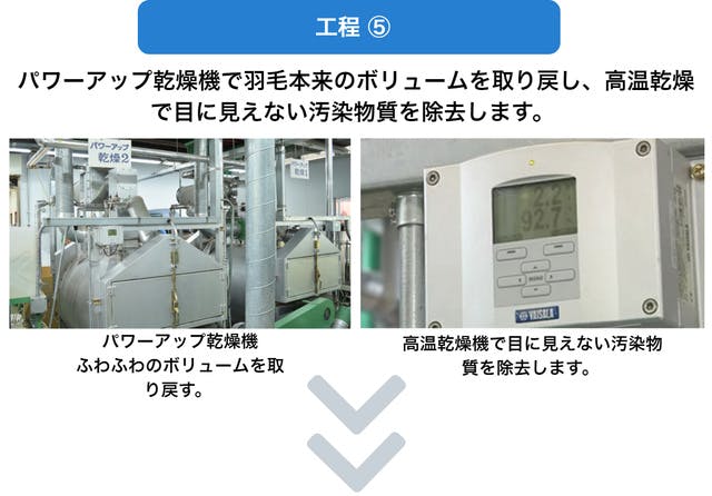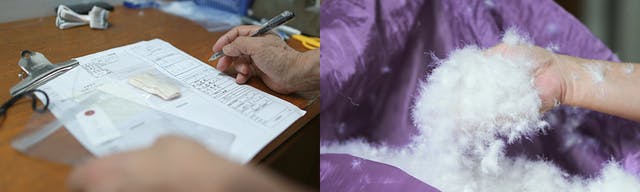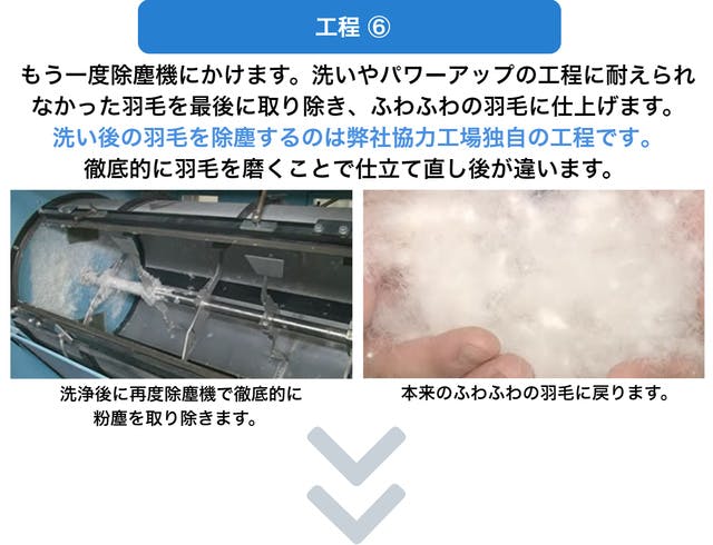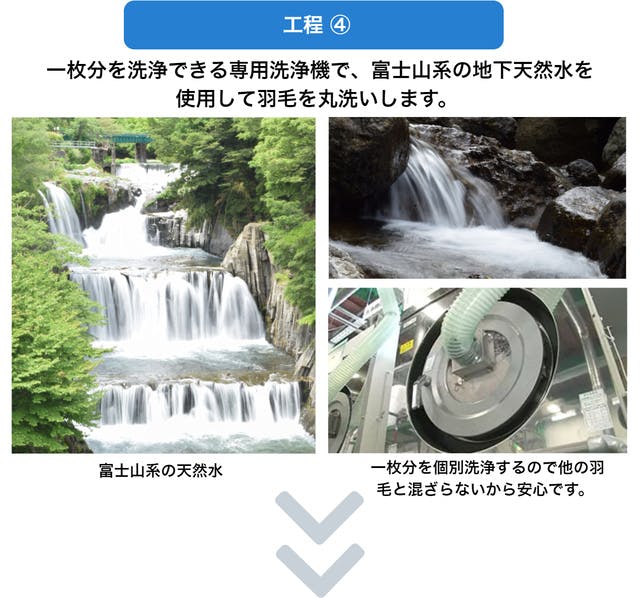 生地から羽毛を取り出して、富士山系の天然水をたっぷり使って丸洗いするだけではなく、チリになって傷んだファイバーを取り除く除塵工程を洗浄前と洗浄後の2度にわたって徹底的に行います。日本羽毛製品協同組合が定める「プレミアムダウンウォッシュ仕上げ」より更に上の丁寧な仕上げです。