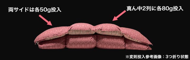 ④羽毛の変則投入により身体にあたる部分とその他の羽毛量を変える事で通常より軽くてあたたかくお休みいただけます。
