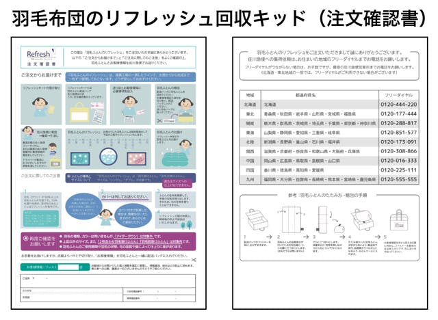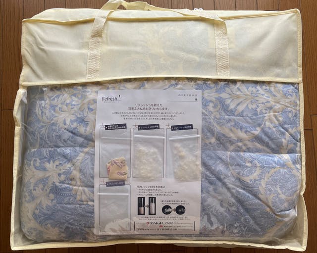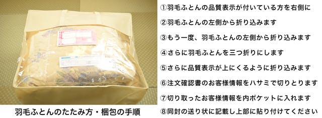 梱包キット(布団バッグ、送り状、送付のご案内)をお送りいたします。内容をご確認の上、お客様の布団(羽毛ふとん)の梱包をお願いいたします。