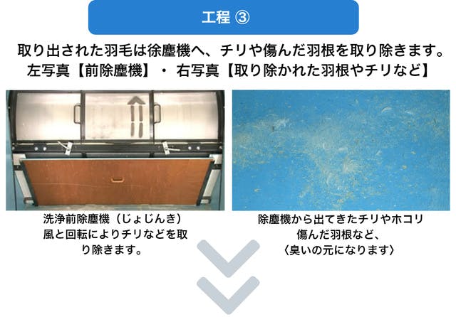 ※羽毛ふとんの臭いは主に羽根ホコリや、汗などが原因です。除塵は臭いを取り除く工程作業です。徹底的に行う弊社の除塵は特別です。