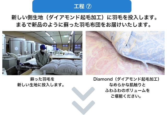 長年使ううちに、羽毛の汚れや損傷で最初のふんわり感がなくなってしまった羽毛ふとんをお預かりし、富士山系天然水を使用して中の羽毛を取り出してから丸洗いするリフレッシュリフォームサービス。新しい羽毛を足し、新しい側生地にお取替えしてふんわり感をよみがえらせます。大切な羽毛ふとんを、長くお使いいただくために、ご使用後、7年目をめやすにお勧めしています。