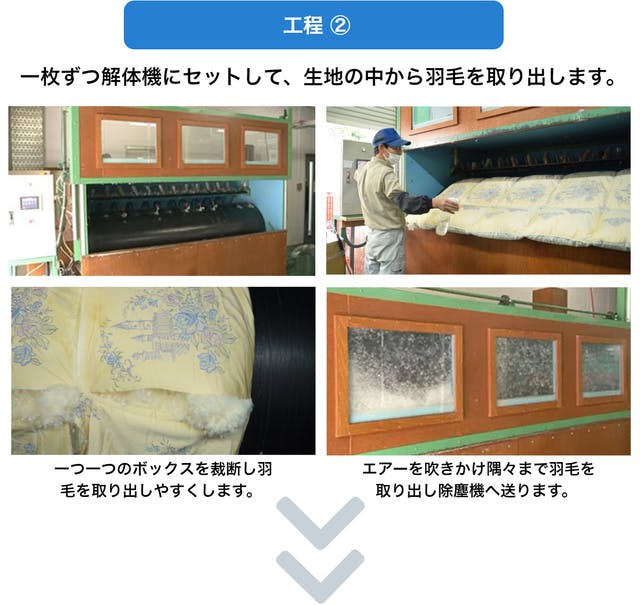 お預かりした応援購入者様の羽毛ふとんを一貫した工程で一枚ずつ解体作業をします。