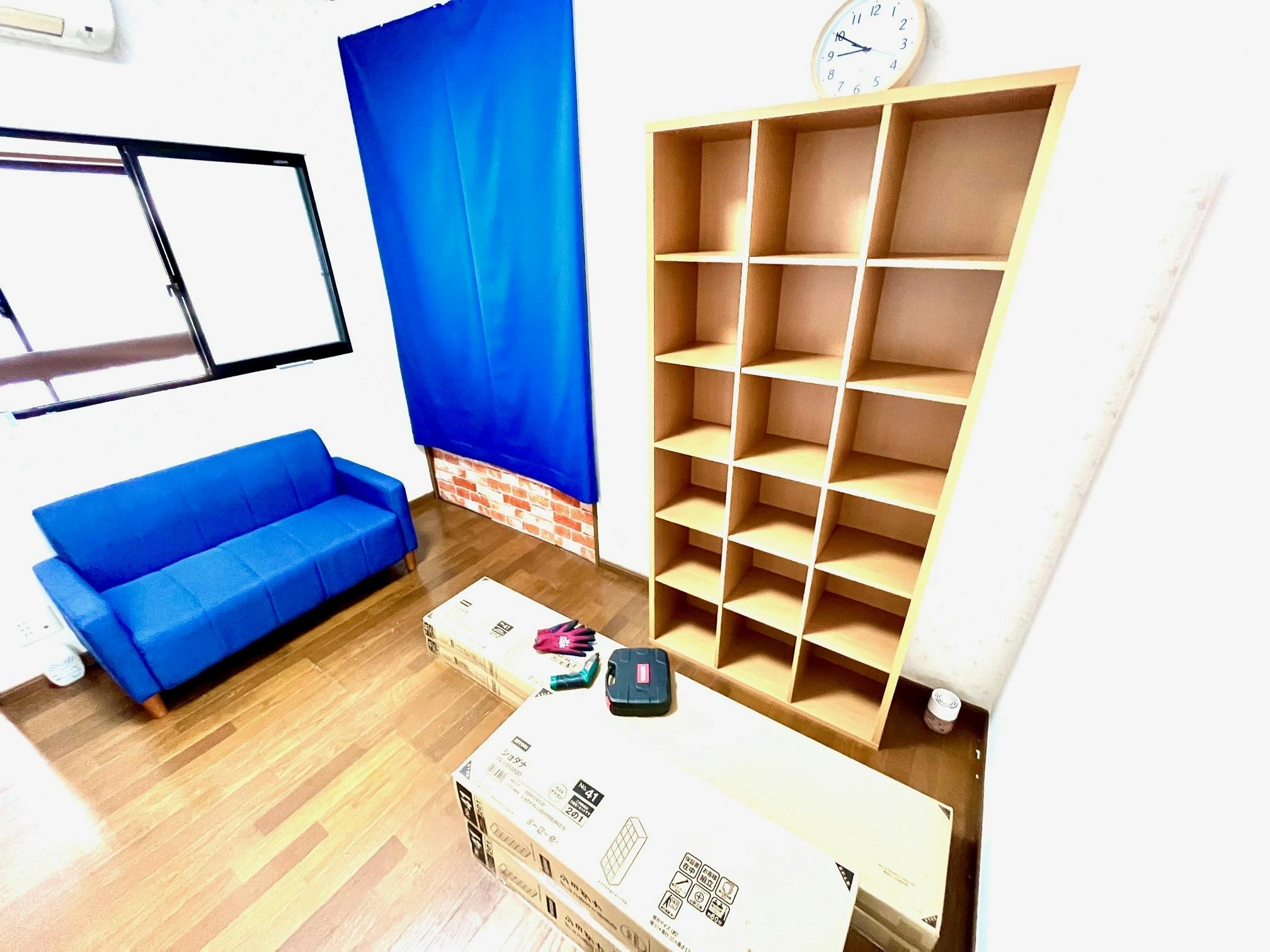 現在、書籍や小物などを展示する本棚(区画)が順次届いており、鋭意スタッフで組み立てている最中です。