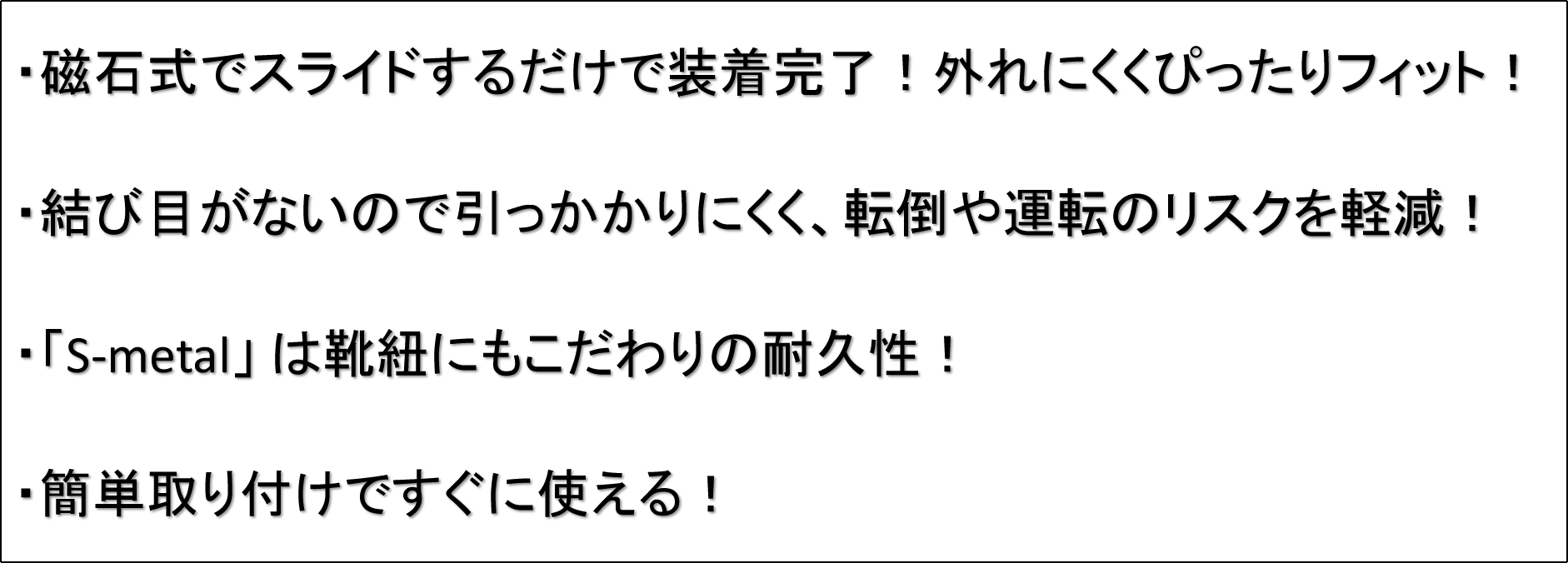 片手で装着できて、よりスマートにお使いいただき、車のペダルや靴紐での転倒を限りなく0にすることを目標にしています。
