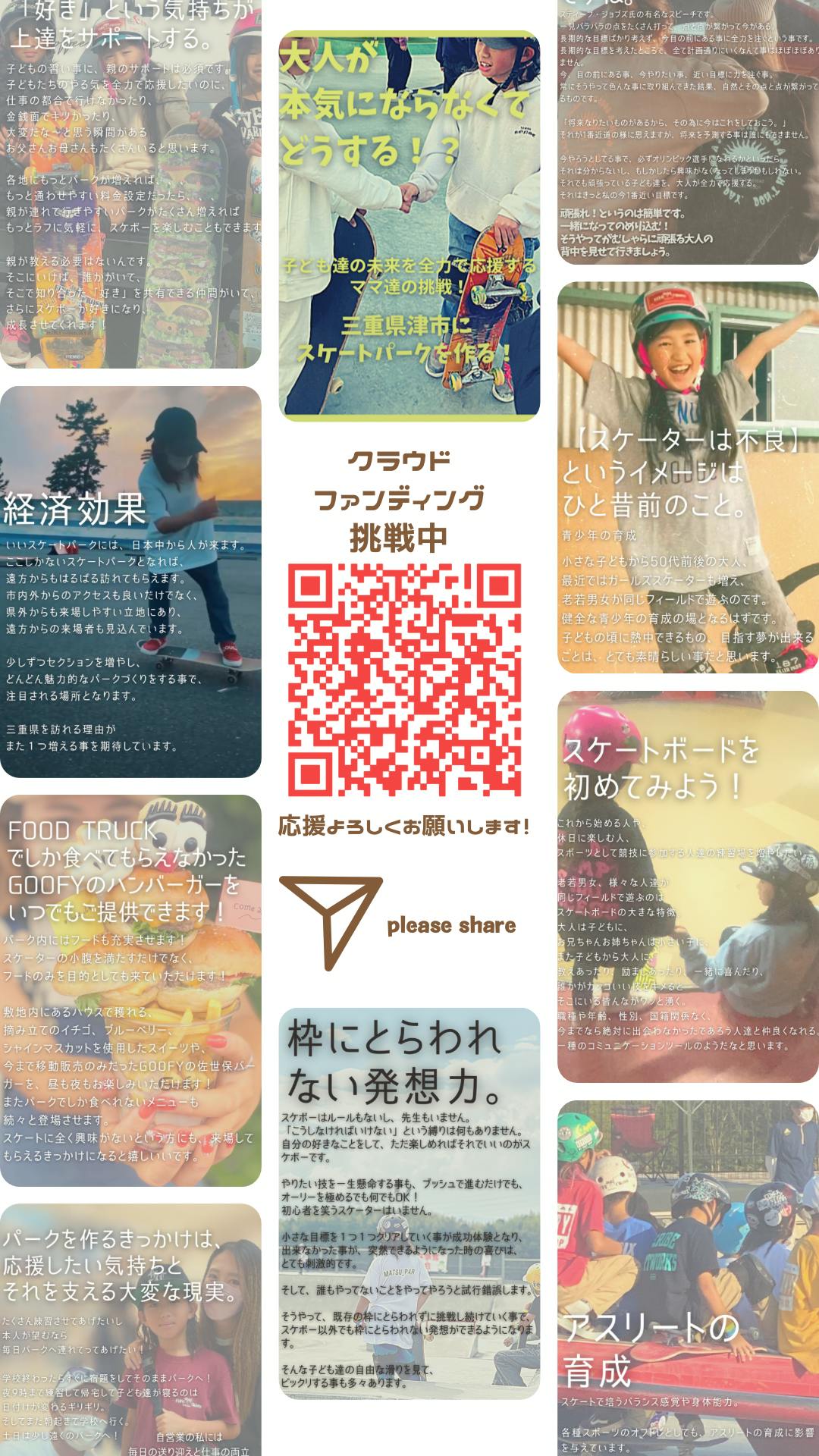 三重県津市にスケボーパーク!現在ネクストゴール挑戦中!青少年の育成、アスリートの育成、経済効果をもたらす場所を作る! スケートボードをこれから始める人、休日に楽しむ人、スポーツとして競技に参加する人達の練習場を作る。 県外からも来場してもらう事で三重を盛り上げたい。