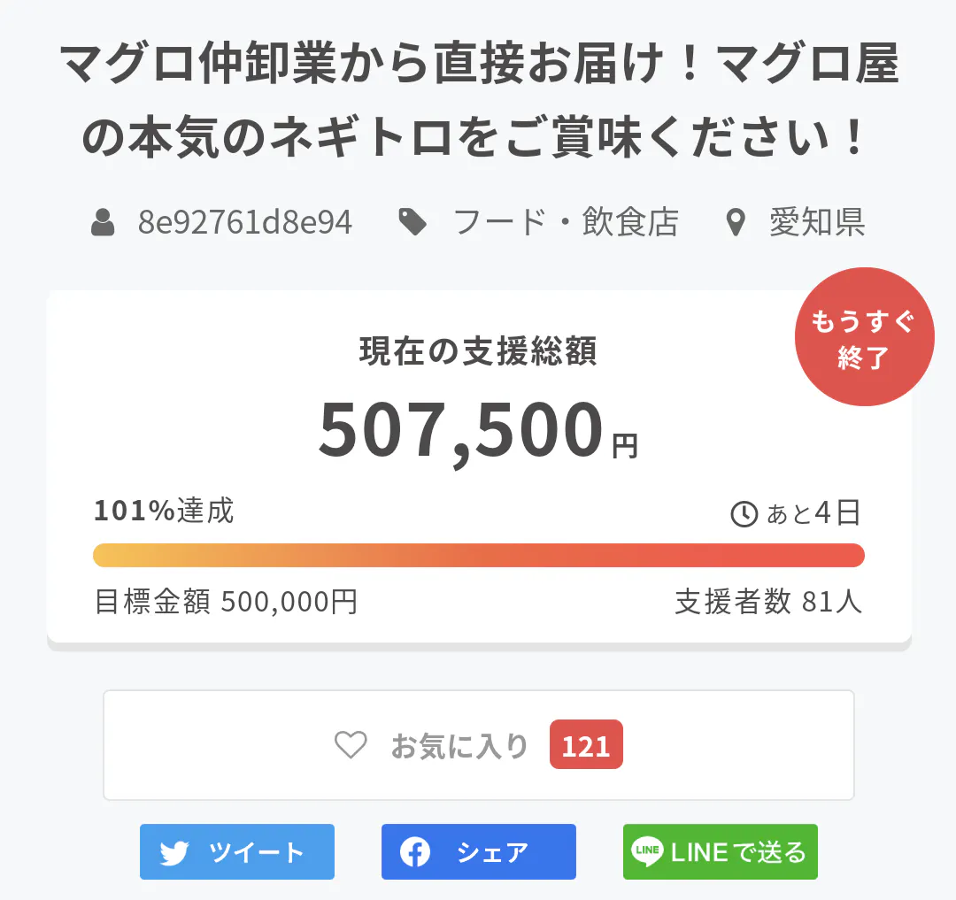今回のクラウドファンディングでご支援いただいた総額から、CAMPFIRE手数料17%を引いた残りをすべて、ネギトロの製造費、広告宣伝費、イベント開催費用、動画制作費の諸費用とさせていただきたく思います。