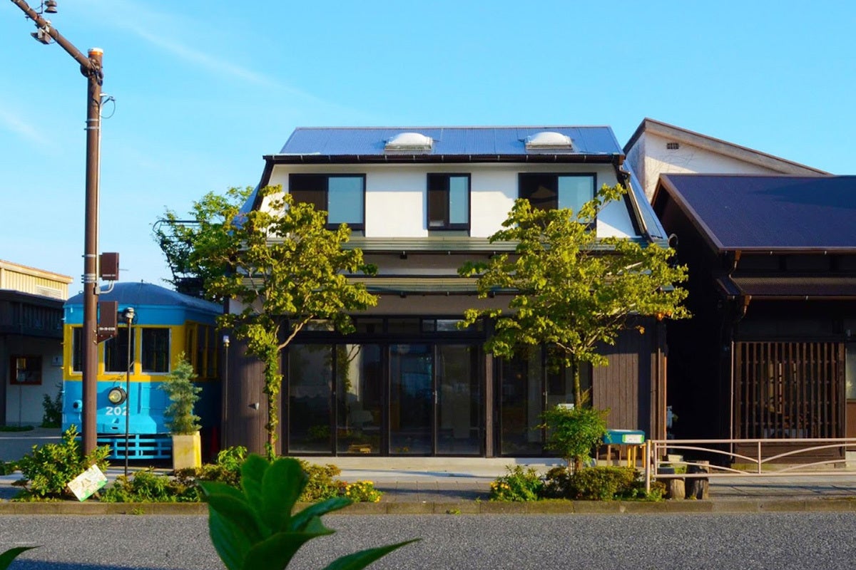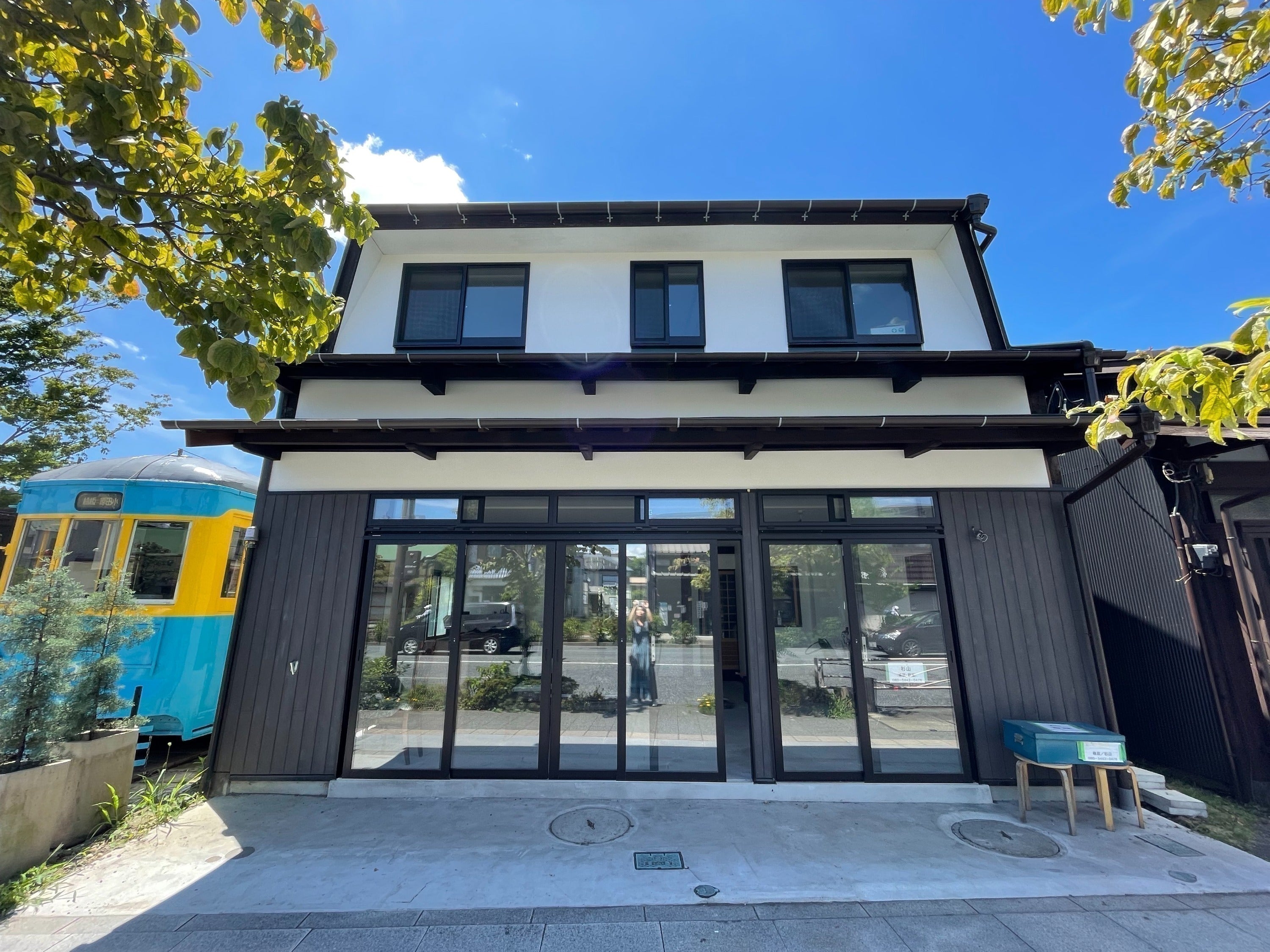 そんな南町で出逢った物件は、観光客も多く行き来する国道1号線沿いにあり、開口部が全面ガラス張り、建物の奥には古くから続く桶工場(桶辰さん)があり、隣には路面電車が展示してある魅力的な物件。