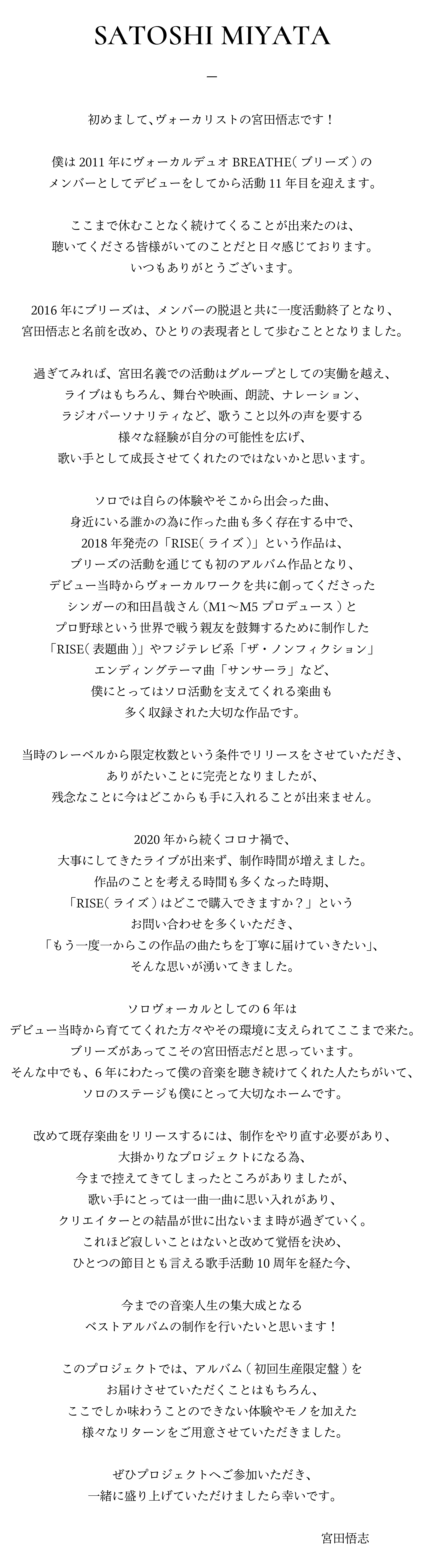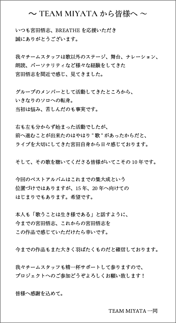 宮田悟志で6年、BREATHEで4年、計10年という音楽人生のこれまでの集大成を込めるベストアルバム。8〜10曲ずつの2枚組、計16曲〜20曲収録を目指します。