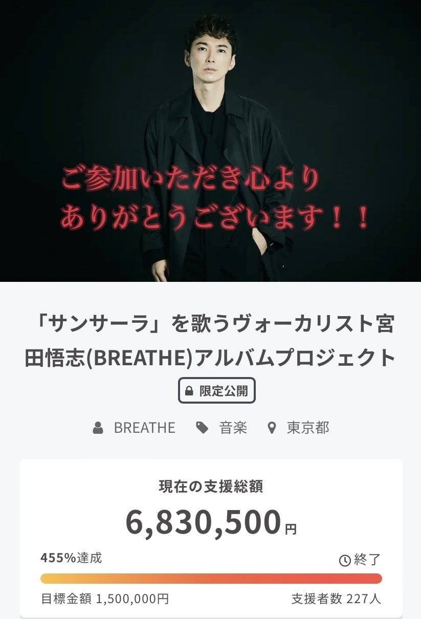 こんばんは!!10月10日をもちまして支援期間が終了いたしました。沢山の方々にご参加いただき感謝いたします。計227人の皆様にご参加いただき、ご支援総額は¥6,830,500となりました。ベストアルバム、ここからいいものに仕立てていきますので、引き続きプロジェクトにお付き合いください。随時活動報告も更新していきます!!本日21:00より宮田悟志インスタグラムにて報告配信致しますので、ぜひご参加いただけましたら幸いです♬改めまして、この度はありがとうございました!!!宮田悟志