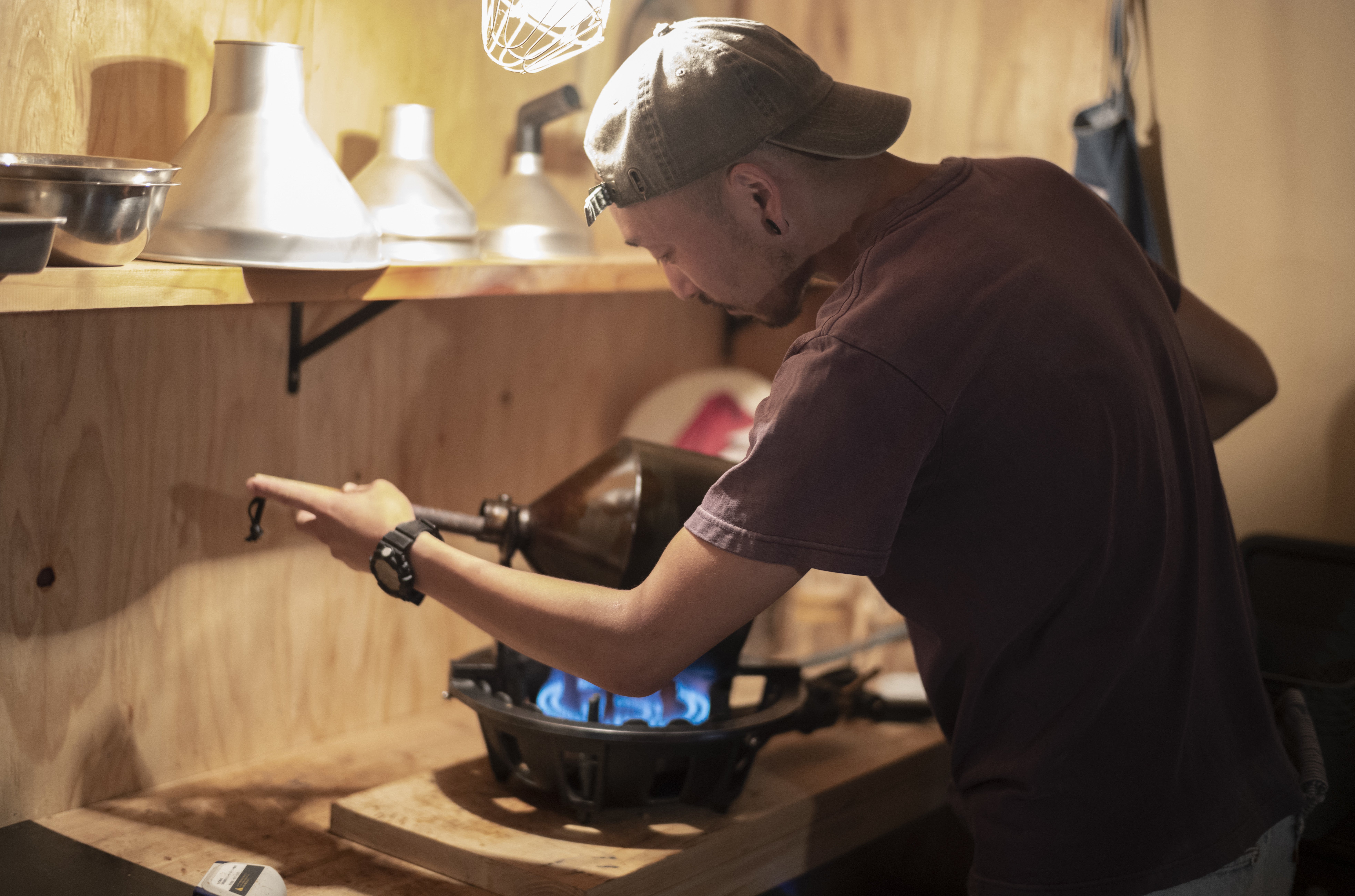 ▲鉄のドラム式手回し焙煎機(Neji coffee roaster)を使って焙煎している様子