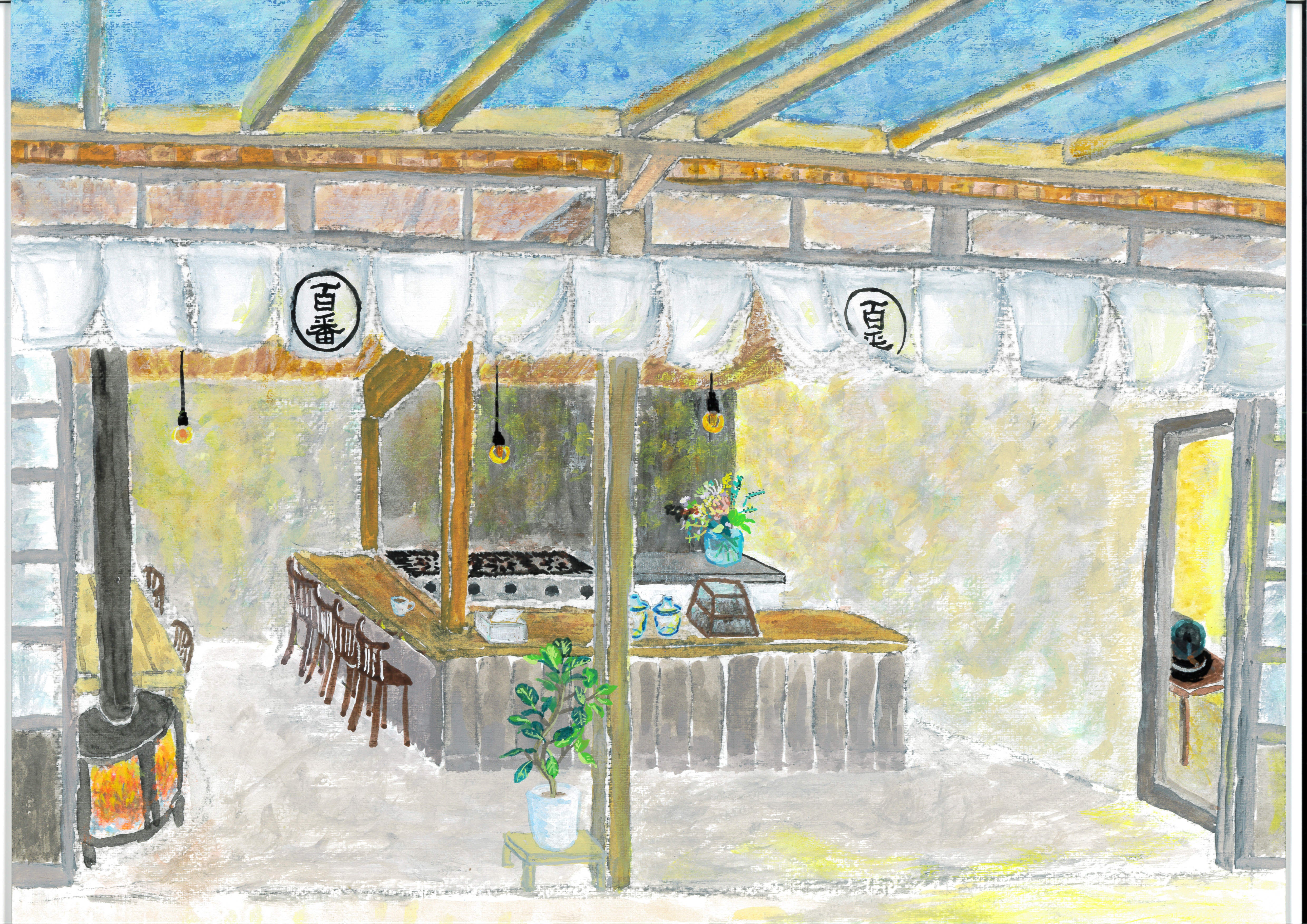 トップにも載せていますが、こちらが「里山の喫茶店 百番珈琲」をテーマに書いて頂いた一枚です。