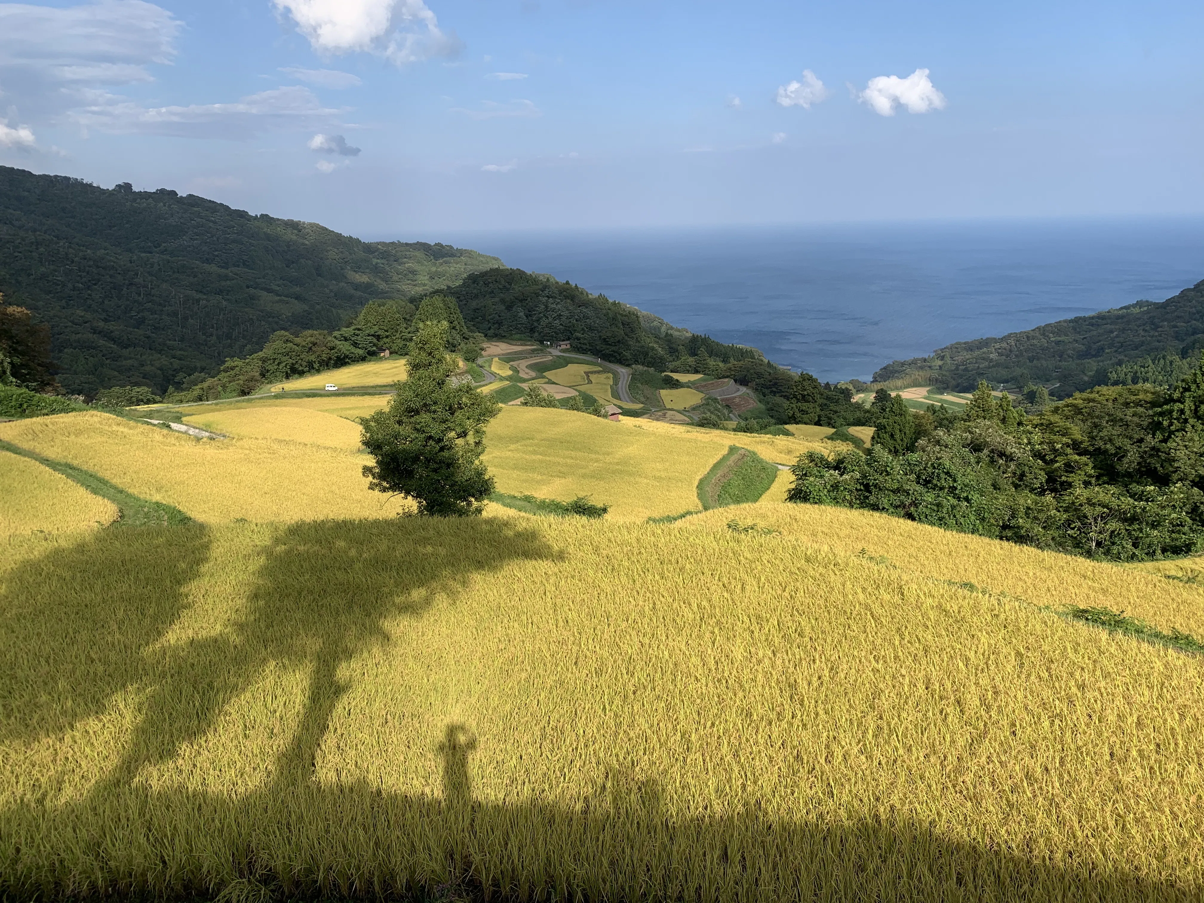 展望台付近から、見渡した棚田の光景を見た瞬間に、沢山の伝統芸能の人々を乗せた北前船が金色の稲の上を浮いて向かってくる光景がイメージできました。