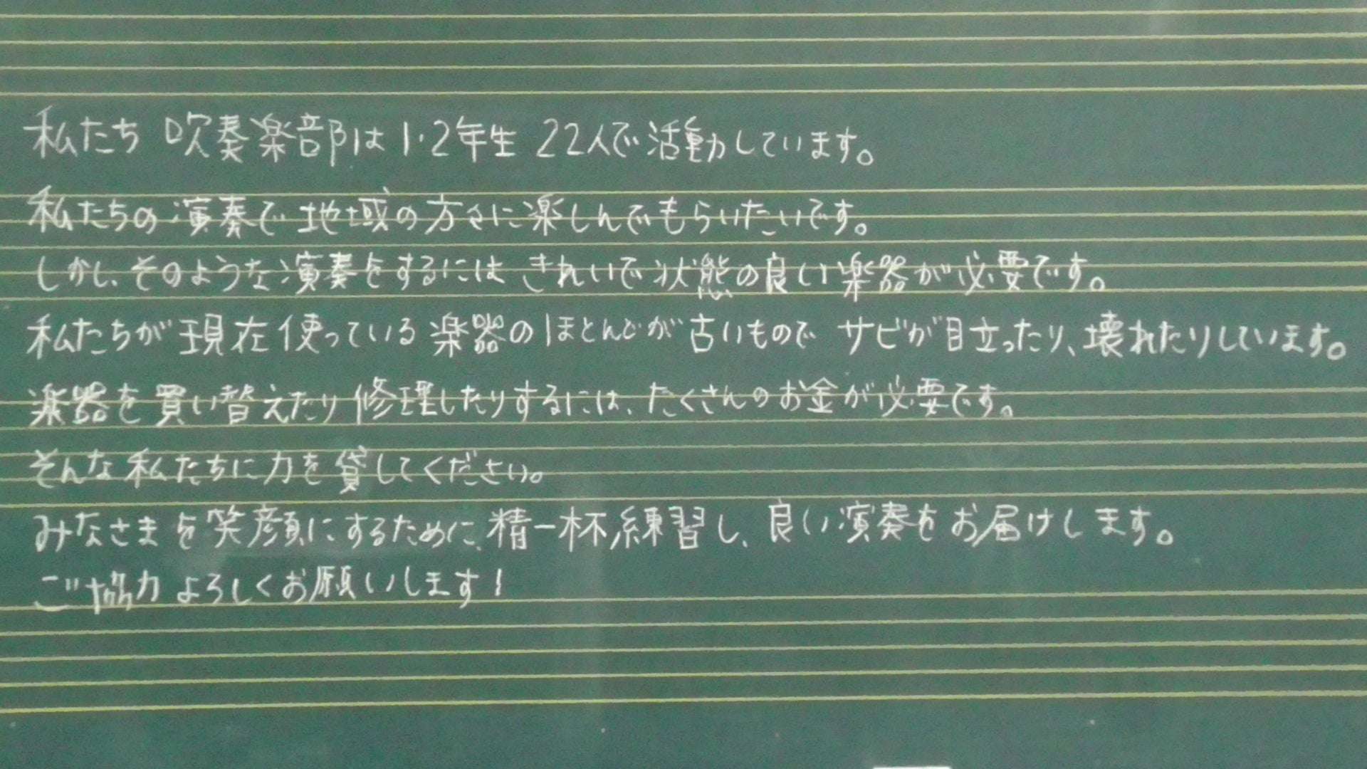 その為、屋外での演奏や行進、楽器の運搬が多く、楽器の劣化や故障により、演奏するための楽器が不足していく状況にあります。部活動の予算はありますが、修理代で全てなくなる状況です。そこで、皆様からのご支援を受けることで、楽器を購入し、地域への貢献を継続させていきたいと考えています。
