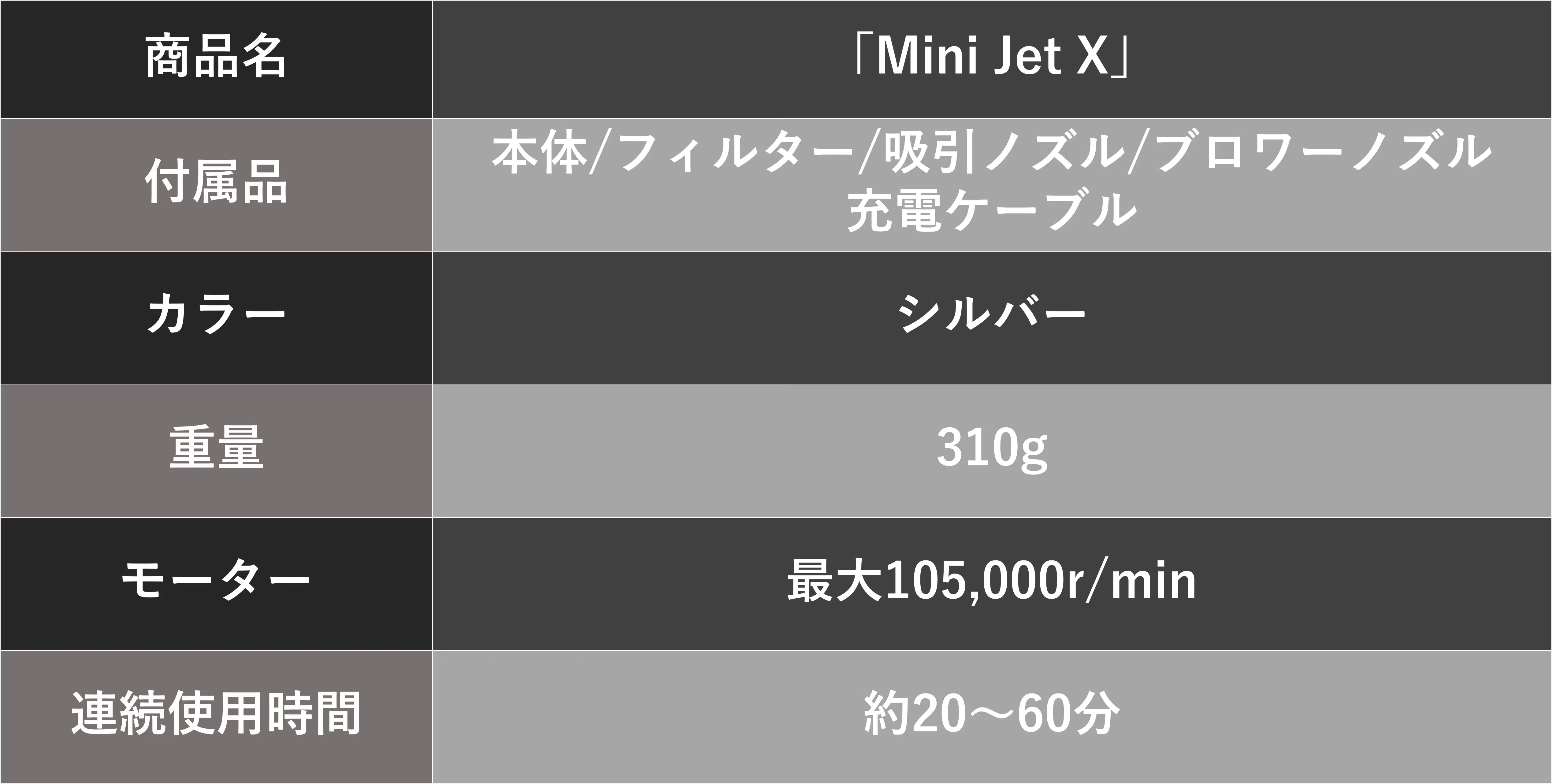 「Mini Jet X」 は約310gと軽量設計なので、女性でも扱いやすく。軽量なのに、パワフルで「使いやすさ」と「機能性」を両立させた設計となっています。