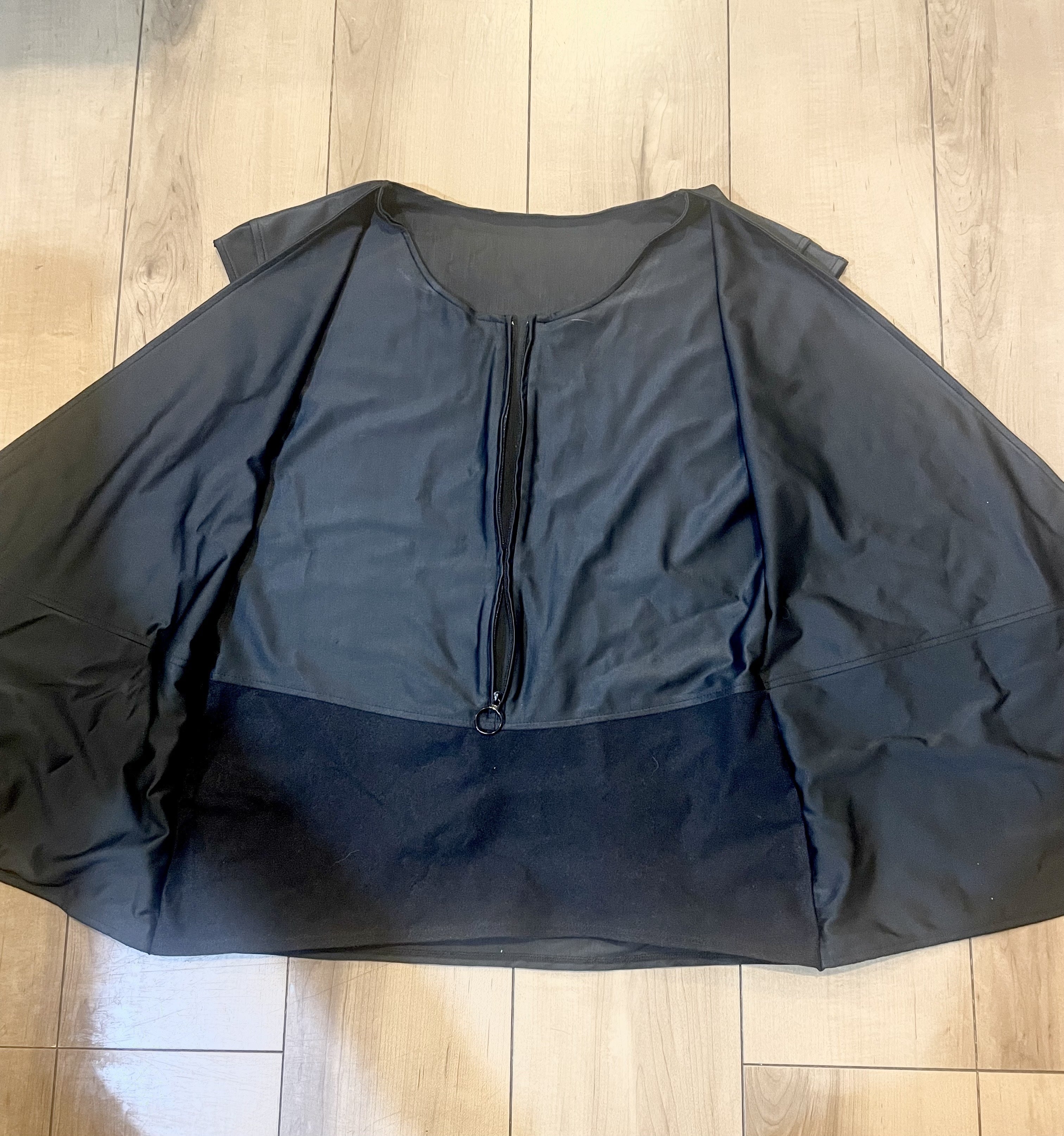 被りタイプは肩の痛みのある方にはつらい、ということから着物やシャツのような合わせるタイプのものを考えました。首回りが大きく開き洋服のようにゆったりと着ることができます。足元からズボンのように履いて着ることも可能です。留めのマジックテープ部分は※トリコットという編み方の生地を使っています。このことにより対応サイズの幅が広がります。金具を使っていないので片手で簡単に留めることができ両サイドどちらからでも可能です。