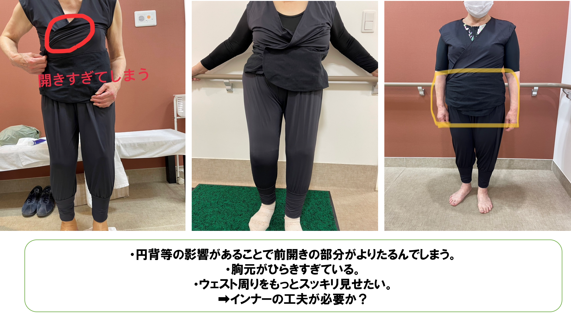 試作品にはインナーをつけておらず胸まわりが開いてしまうこと、生地が薄く水の中で広がりやすくなってしまうこと、透けやすいことなどが分かりました。