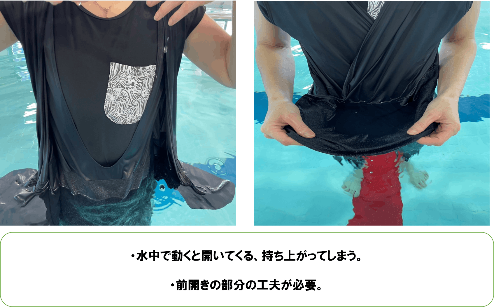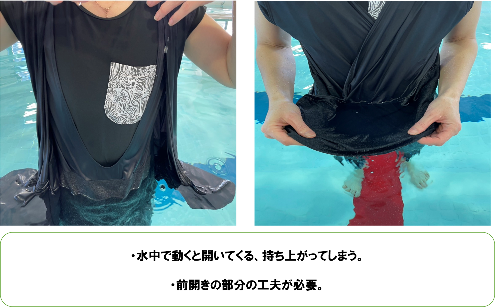 ロッカールームで着替えの大変さを目の当たりにしていたことと、水着の入手方法が分からず相談を受けることが多かったことにあります。既存の水着は殆どが泳ぐことが前提で身体に密着しタイトに作られています。しかしそれでは半身麻痺の方や指先の動きが困難な方、一般的に関節痛の多い高齢の方々には着脱が困難な場合が多いのです。