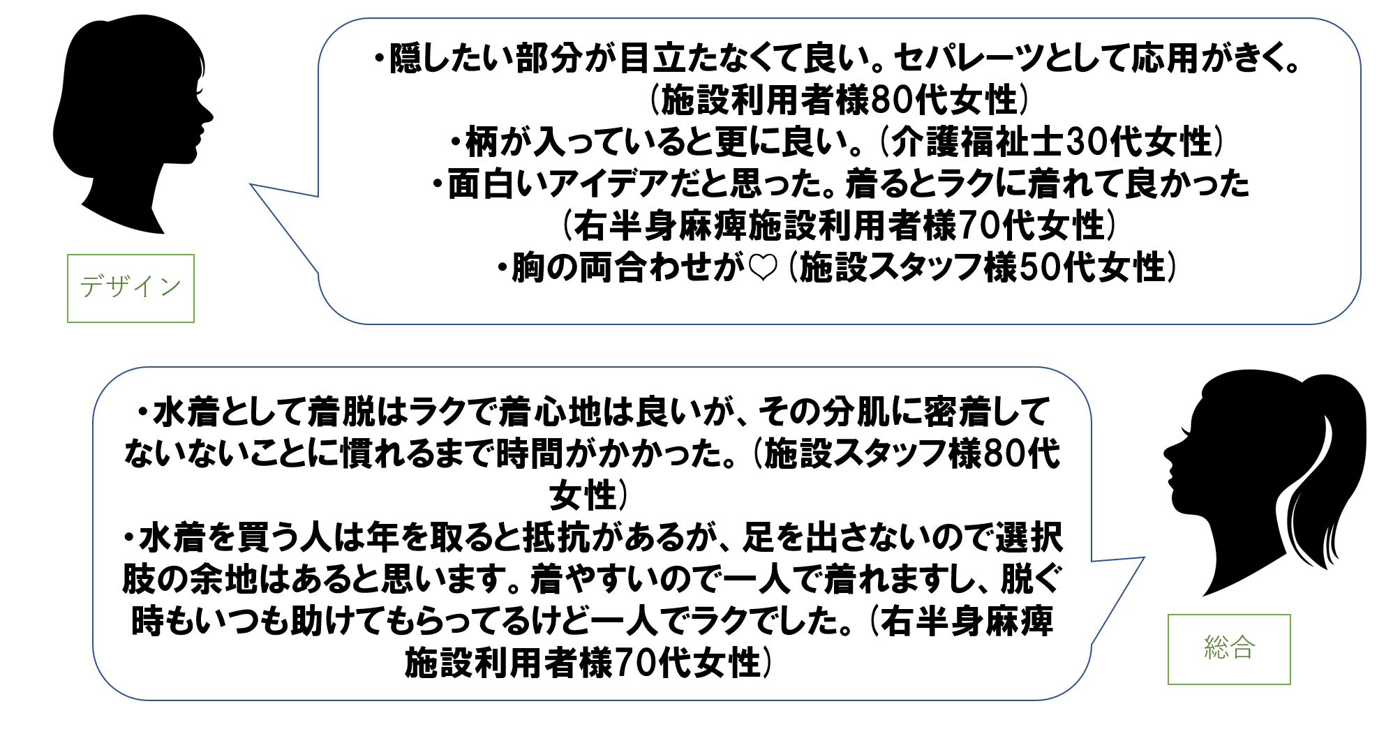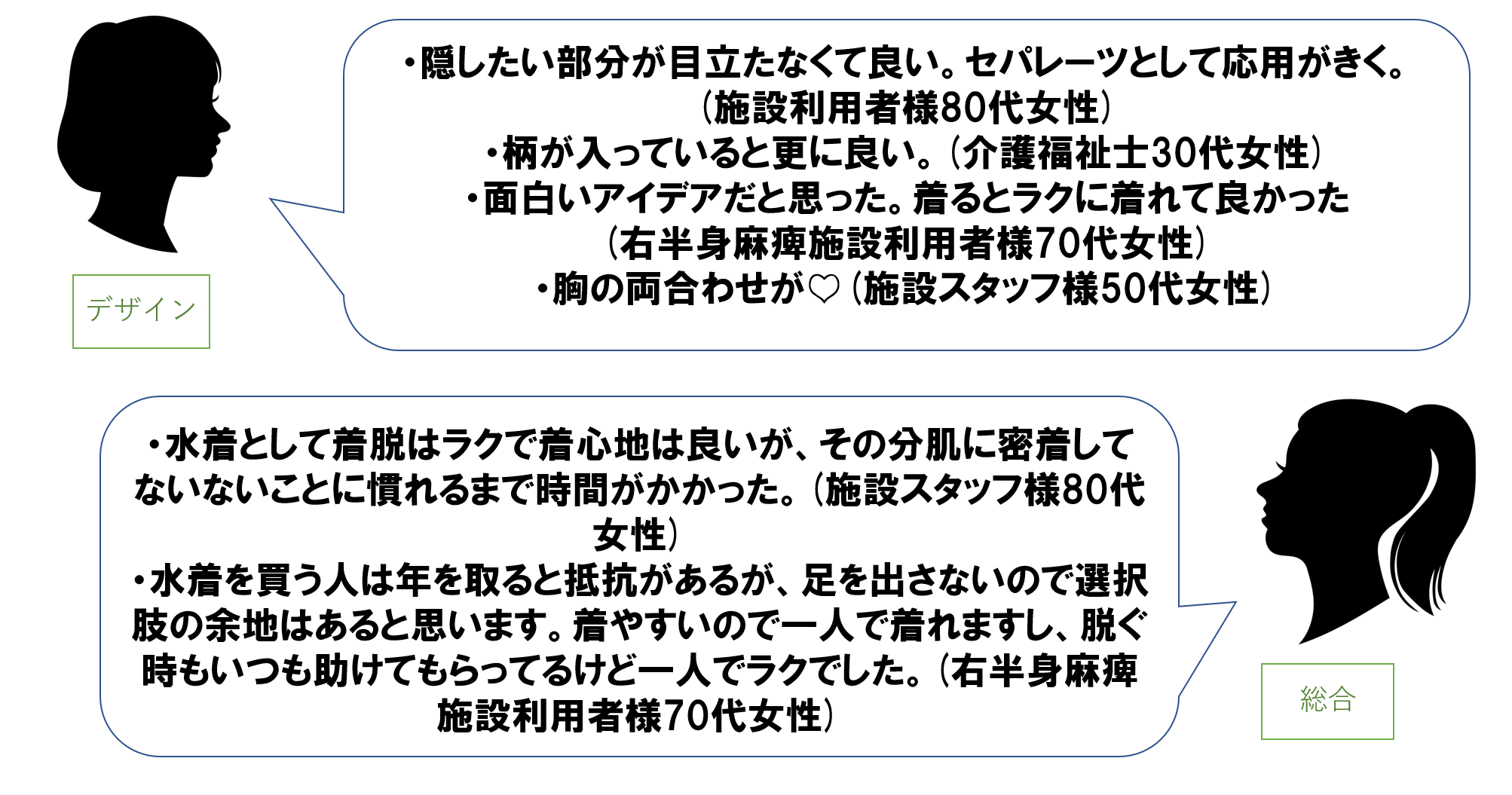 水着は欲しいけどネットショッピングのやり方がわからない、買いに行くところがない、何十年も前の水着を着ている、などの意見もありました。体の事情から着ることのできる水着が限定される場合もあり、多くの方が試着や相談を望んでいらっしゃいました。