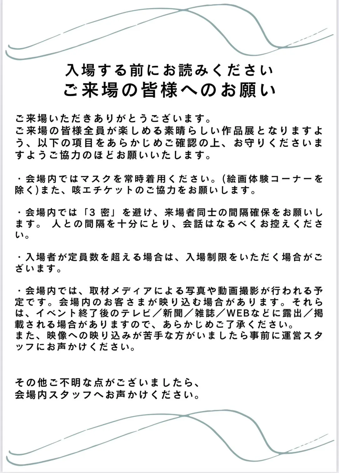 以上、作品展開催にあたり主催者からのお知らせとお願いになります。