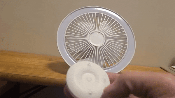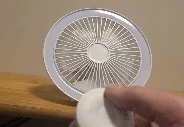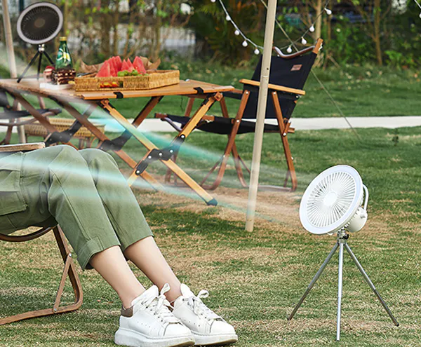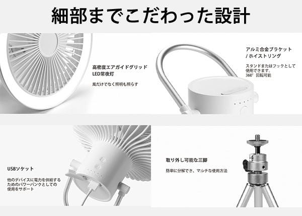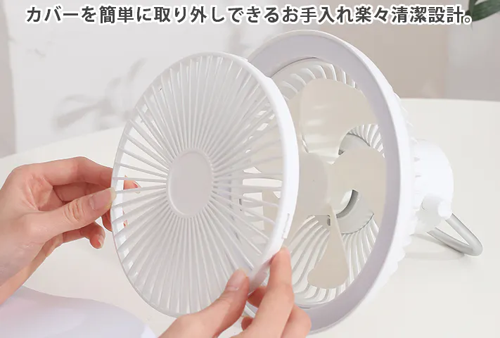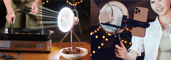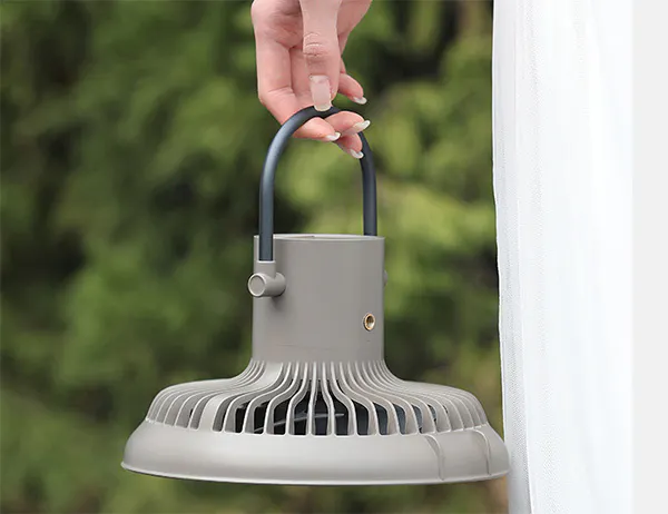 IZELL-F30は取っ手付きなのでテント内の天井や料理や作業中に上からLEDライトで照らしながら風を送る事が出来ます。