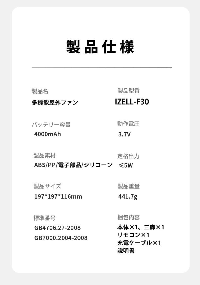 IZELL-F30の特徴は「持ち運び可能」「足が取り外せる」「リモコン付き」「大容量電池」「パワーバンクになる」です。