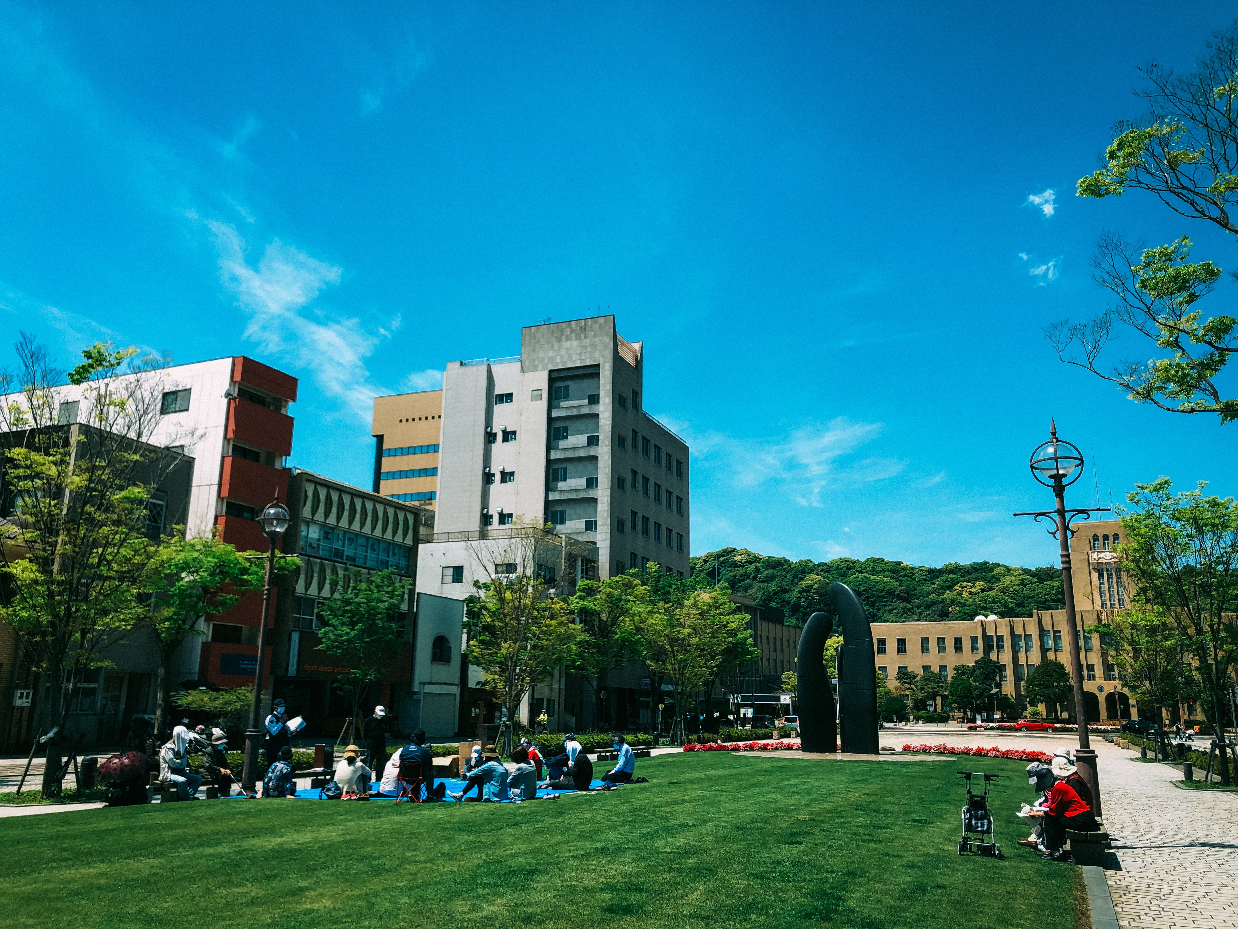 右奥が鹿児島市役所。名山町に隣接するみなと大通り公園では町内会のイベントが行われます
