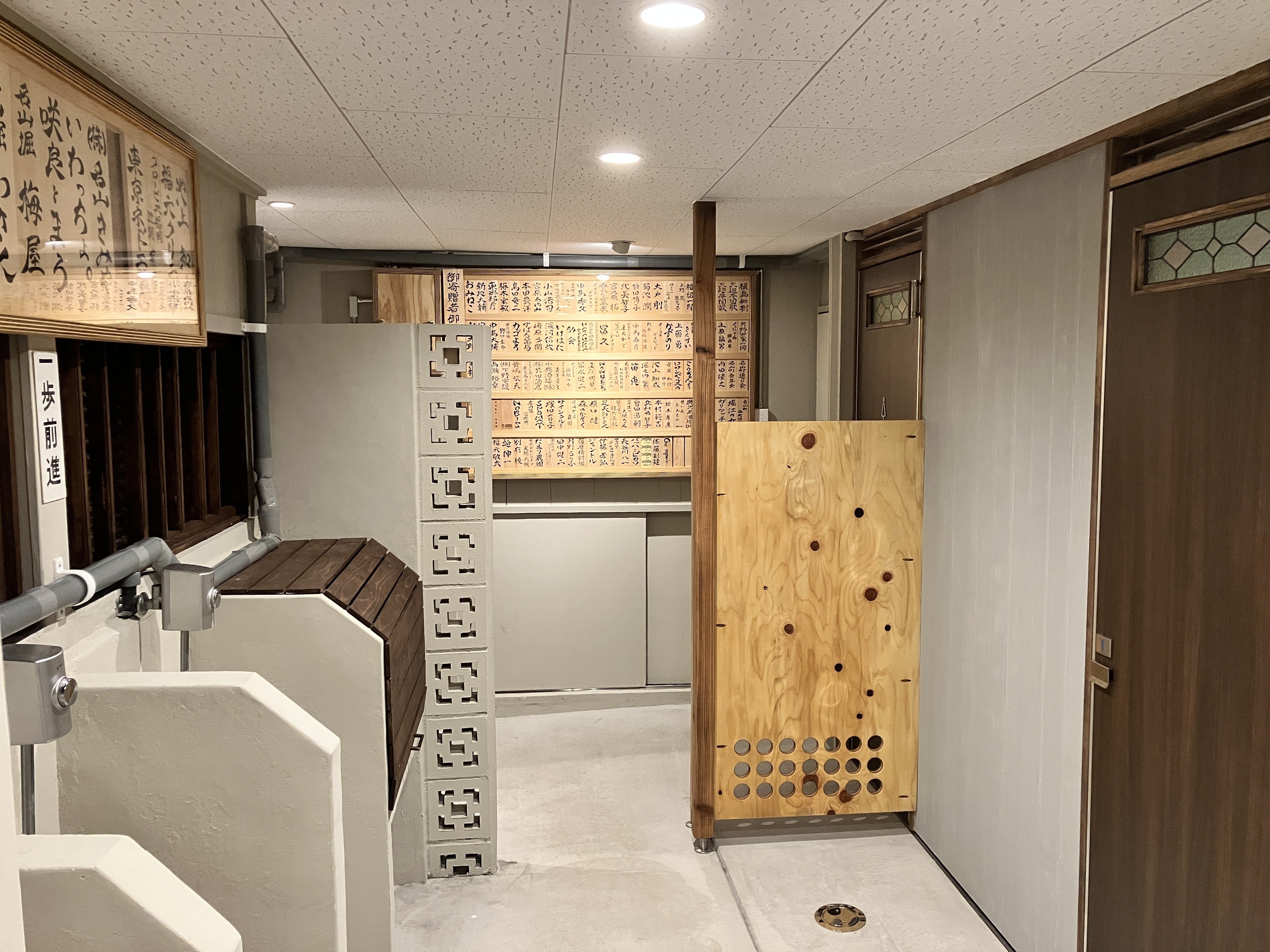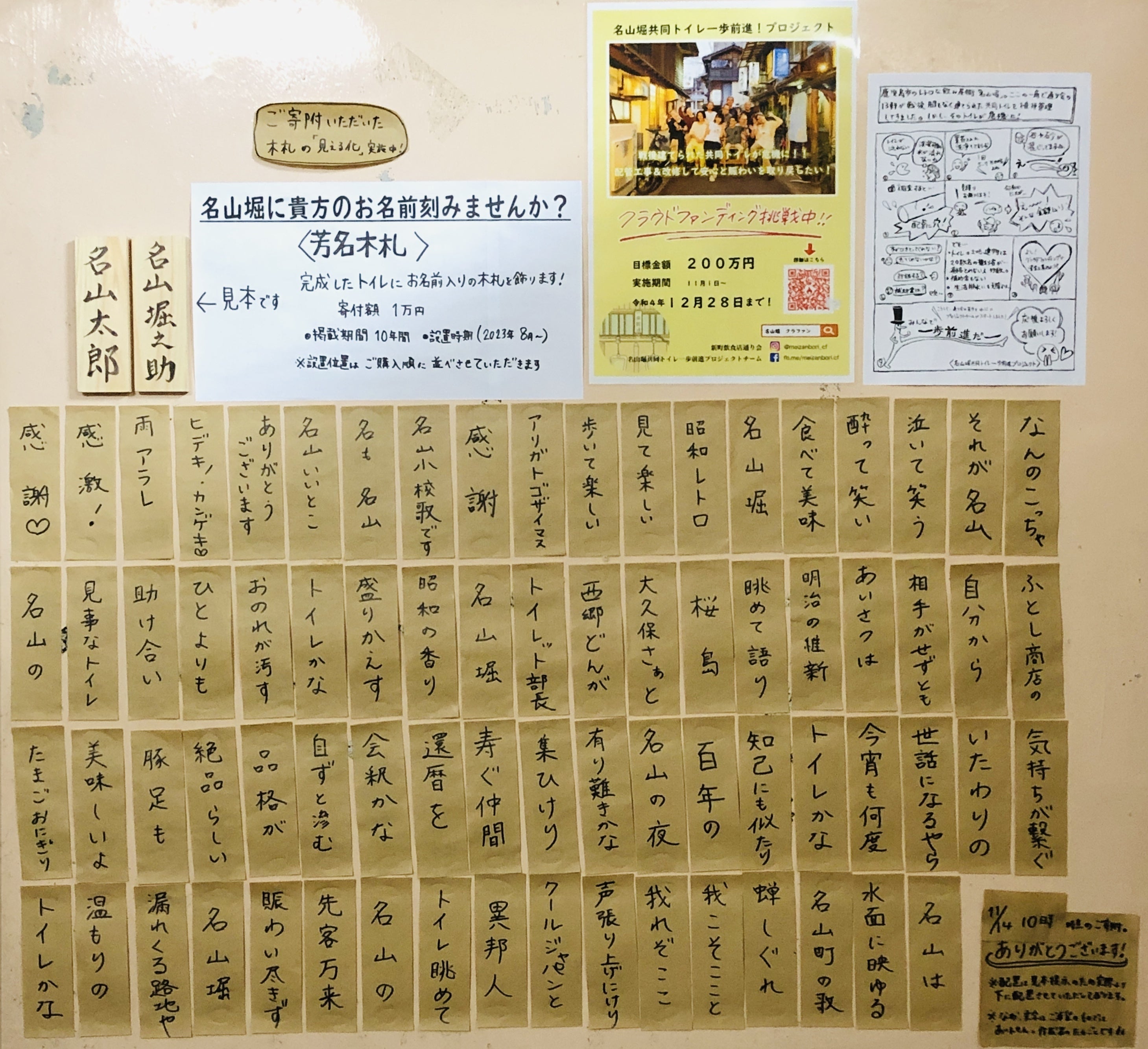 共同トイレでは芳名木札のご購入状況を紙のサンプルで見える化しています!(サンプルに書いた文字は支援者様とは関係がございません)