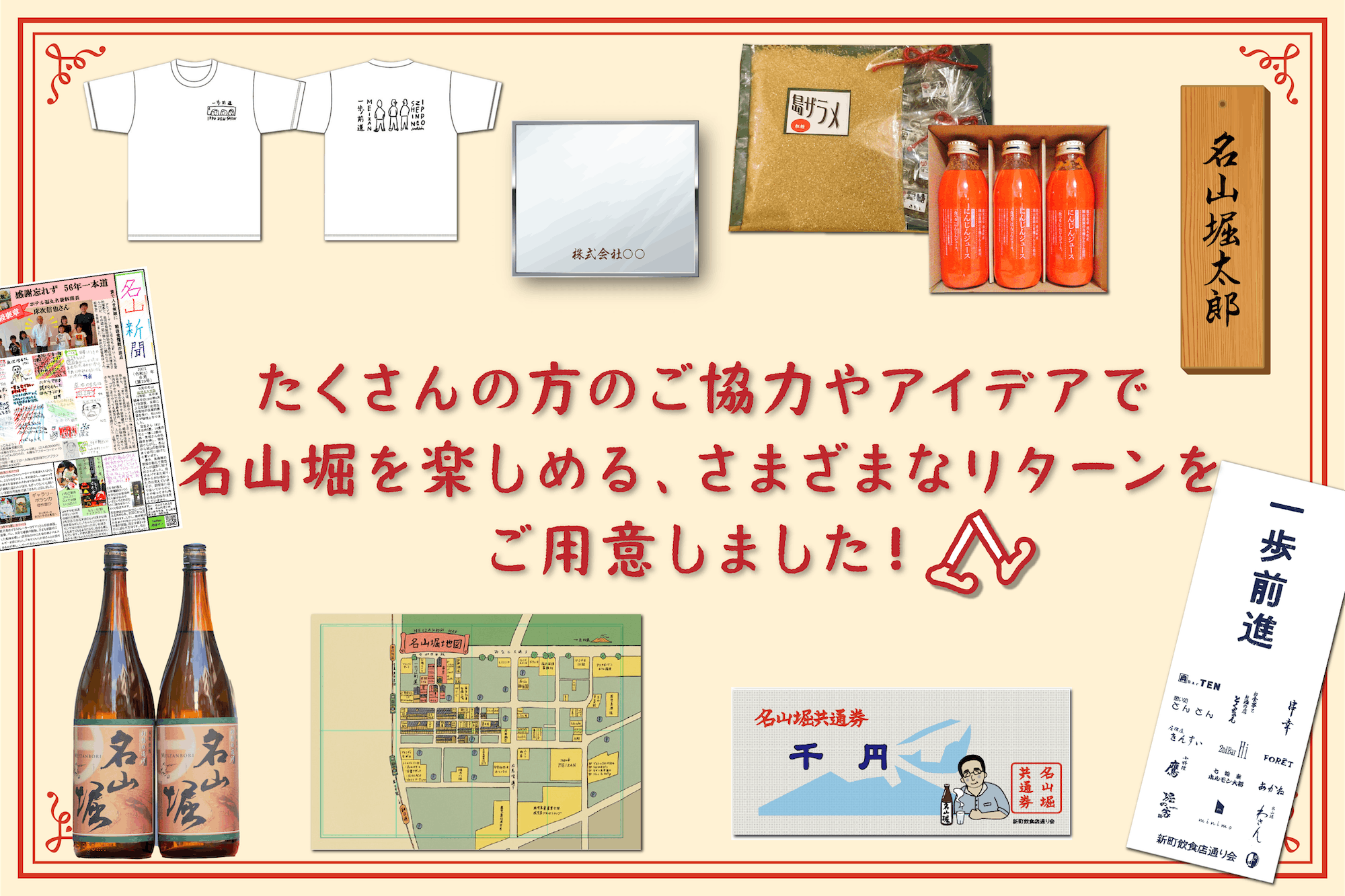 このプロジェクトを成功させ、安心して住み続けられる名山堀、不安なくお店を続けられる名山堀、快適でありながらノスタルジックを感じられる名山堀をつくるために、ぜひ皆様のご協力を賜れましたら幸いです。