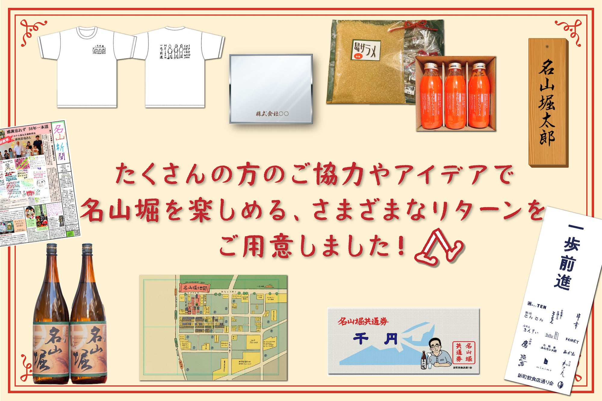 ※「お礼のメッセージ」以外のすべてのリターンに共通で、<名山堀地図と名山新聞お楽しみ1枚>を郵送させていただきます。複数のリターンをお申し込みの方で、地図や新聞が不要の場合は備考欄にお書きください。