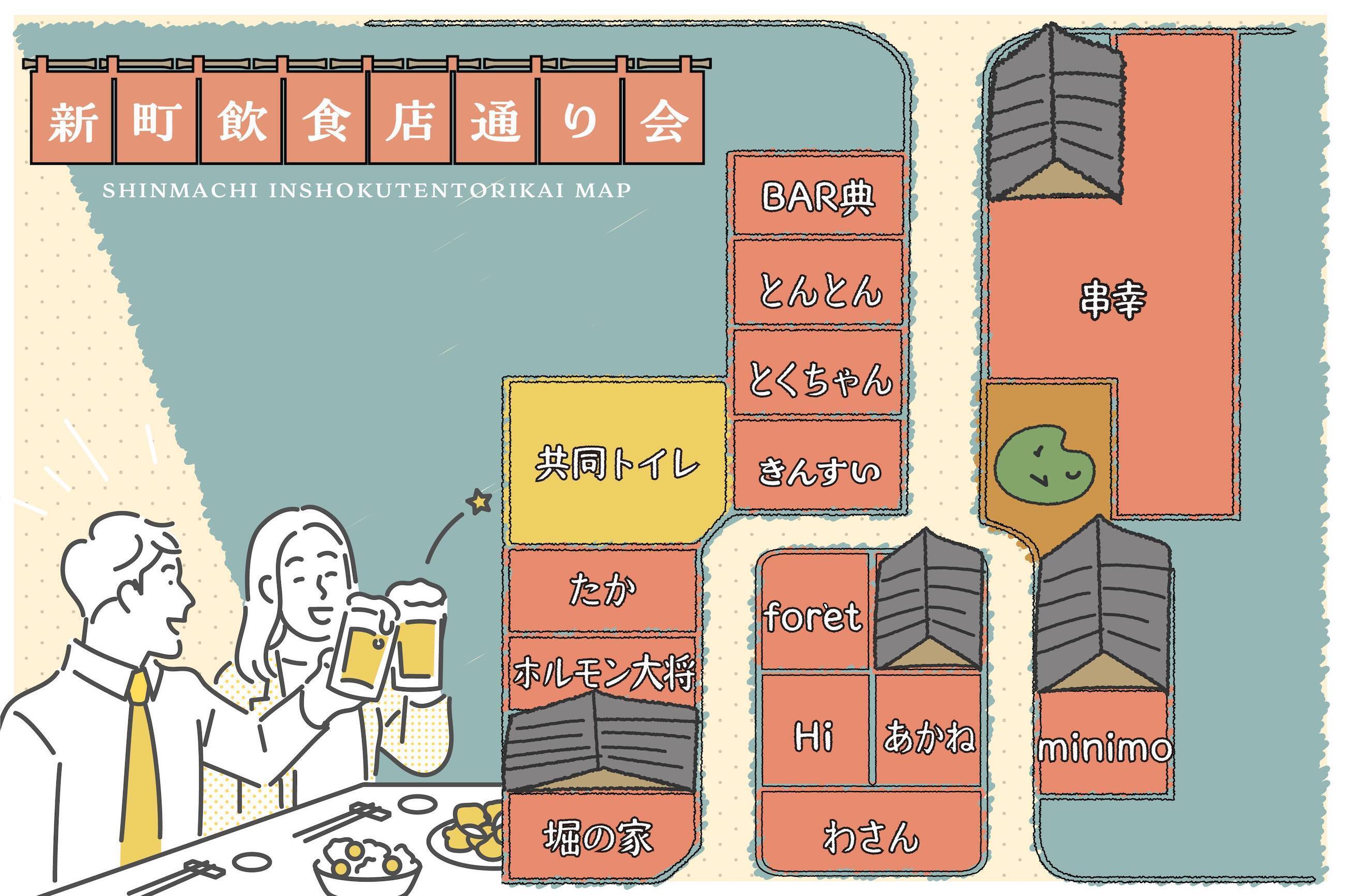 共同トイレは戦後(登記上はもっとも古い記録で昭和47年)20軒ほどの飲食店の有志がお金を出し合って建てたものです。周辺の飲食店で構成する「新町飲食店通り会」(現在13軒)で、毎月積み立てをして改修や補修の費用に充て、当番制で毎日掃除をしながら維持管理してきました。