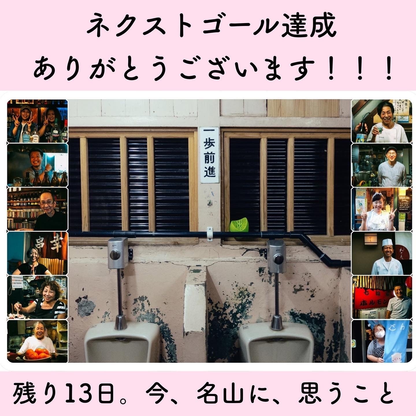 【御礼】ネクストゴール300万円を達成いたしました。268名の方にご支援いただき、ネクストゴールを達成しました。本当にありがとうございます。思えば、今春、共同トイレの劣化が発覚し、通り会のメンバーで今後のまちづくりを含めた方向性について話し合いを重ね、お金をかけてでも、この名山堀のシンボルとも言える共同トイレを守ろうと、そしてその方法としてクラウドファンディングにチャレンジすることを決めました。6月に最初の話し合いの場を持ってから約半年走り続け、ネクストゴールを達成した今、思うこと。それは、私たちは本当にたくさんの方々に支えられているということ、お一人お一人への感謝と、それを感じることができたこの機会への感謝です。クラファンスタート前は、未知のことに不安で不安で仕方ありませんでした。たくさんの意見もいただきました。しかし、通り会、名山町を飛び越えてたくさんの方々から応援をいただき、つながりを感じ、「名山ってたくさんの人に愛される、応援してもらえる、いいまちだなあ」と素直に感じました。今まで以上に名山町を好きになりました。今後は、自分たちのお店や通り会だけではなくて、名山町全体のことにも目を向けていきたい、町のことに積極的に関わり、逆に私たちにできることは協力をして恩返しをしていきたいという気持ちを持つことができました!今後も名山町全体が、賑やかで、多くの方に楽しんでいただけるまちになるよう、取り組んでいきます!そのためにも、まずはクラウドファンディング終了までの残り13日、感謝の気持ちを持って、お店の営業、そして共同トイレのお掃除・・・と名山堀の日常を紡いでいきます。最後まで、見守り、応援、そしてこの名山堀の小さな #一歩前進 のことを、ちょっとずつ、広めていただけましたら幸いです。名山堀共同トイレ一歩前進プロジェクトチーム一同