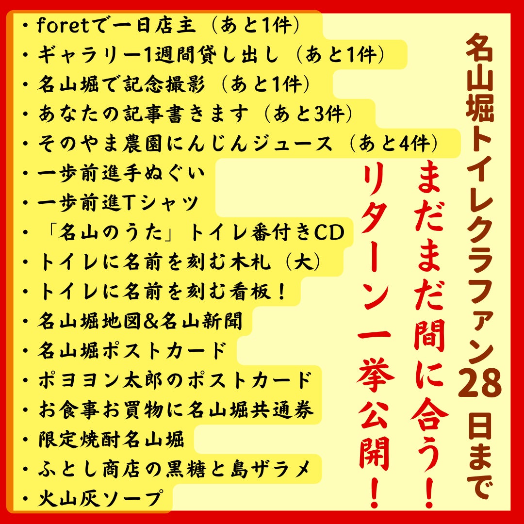 おはようございます!寒いですね。名山町の今朝の気温は3℃!雪が降るかもしれません。皆様、暖かくしてよいクリスマスをお過ごしくださいね★さて、クラファン終了まであと4日となりました。これまでご支援いただいた皆様、本当に、本当に、ありがとうございます。最後まで、一人でも多くの方に名山のこと、共同トイレのことを知っていただきたく、まだまだ間に合うリターンをまとめてみましたクリスマスに、ちょっと早めのお正月に、自分へのご褒美に、大切な方へのプレゼントに、楽しんで選んでいただけましたら幸いです!名山の人たちがアイデアを出し合って用意したとっておきのリターンです♪・foretで一日店主(あと1件)・ギャラリー1週間貸し出し(あと1件)・名山堀で記念撮影(あと1件)・トイレに名前を刻む看板!(あと2件)・あなたの記事書きます(あと3件)・そのやま農園にんじんジュース(あと4件)・トイレに名前を刻む木札(大)・一歩前進手ぬぐい・一歩前進Tシャツ・「名山のうた」トイレ番付きCD・名山堀地図&名山新聞・名山堀ポストカード・ポヨヨン太郎のポストカード・お食事お買物に名山堀共通券・限定焼酎名山堀・ふとし商店の黒糖と島ザラメ・火山灰ソープ名山町ナイトバザーご来場ありがとうございました12/18(日)、クラファンチームのブースも盛況。焼きおにぎり、スープ餃子、ホルモン煮、リターン商品など、お楽しみいただきました。ステージでは名山のご当地シンガー「名山あるこ」さんによる「名山のうた トイレ番」のお披露目もありました。雨にも関わらず多くの皆様にお立ち寄りいただき、ありがとうございました。本プロジェクトの拡散にご協力いただけましたら幸いです!あと4日、少しずつでも拡散にご協力いただけましたら幸いです。<拡散の際は以下の文を参考にされてください>===【シェアお願い】名山堀の共同トイレのクラファンは28日まで★鹿児島のレトロな飲み屋街「名山堀」にある"共同トイレ。お客様にとって不可欠なだけでなく、トイレで出会った人が仲良くなって一緒に2軒目に行くなど、トイレコミュニケーションも生まれる貴重な場!しかし老朽化で、配管が壊れて使えなくなってしまっています。トイレを改修して、名山堀に安心と賑わいを取り戻したい!★詳細はキャンプファイヤープロジェクトページをご覧ください。https://camp-fire.jp/projects/view/613346#一歩前進#名山堀クラファン#名山堀#名山町#名山堀トイレ#鹿児島#campfire#キャンプファイヤー===これまでの皆様のご支援、誠にありがとうございます。名山の楽しさ・おいしさ・古き良さを伝え、「名山堀ファン」の輪を広げていきたいと思っています!12月28日23:59の終了まで、どうぞよろしくお願いします!名山堀共同トイレ一歩前進クラウドファンディングチーム一同