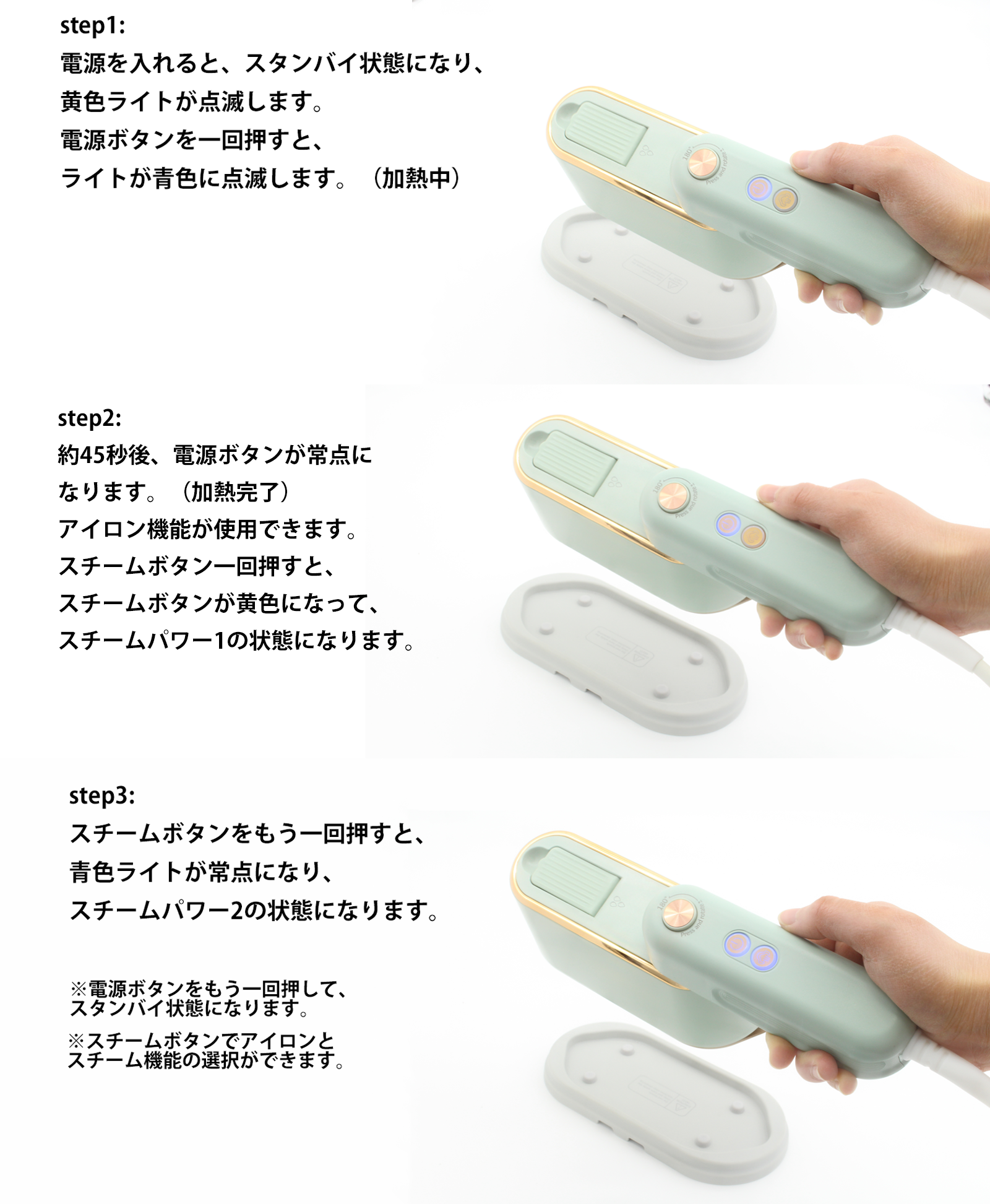 スチームボタンを10分間押さないと電源が自動OFF。スタンバイ状態になります。