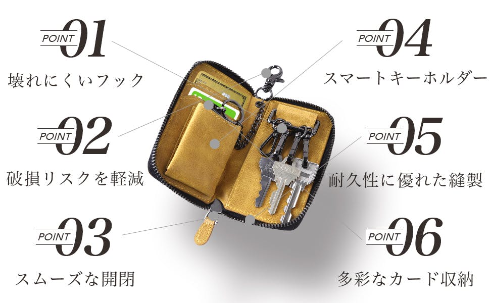 ⑤ハガネのキーフックは、4つ付いています。1個のキーフックに複数のカギを取り付けられます。当商品が壊れた場合は、返品・交換を致します。