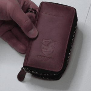 ④自動車用のスマートキーを結ぶチェーンとスマートキーをしまうポケットが付いています。ポケットにしまうことで、スマートキーが壊れたり、傷ついたりするのを防いでいます。