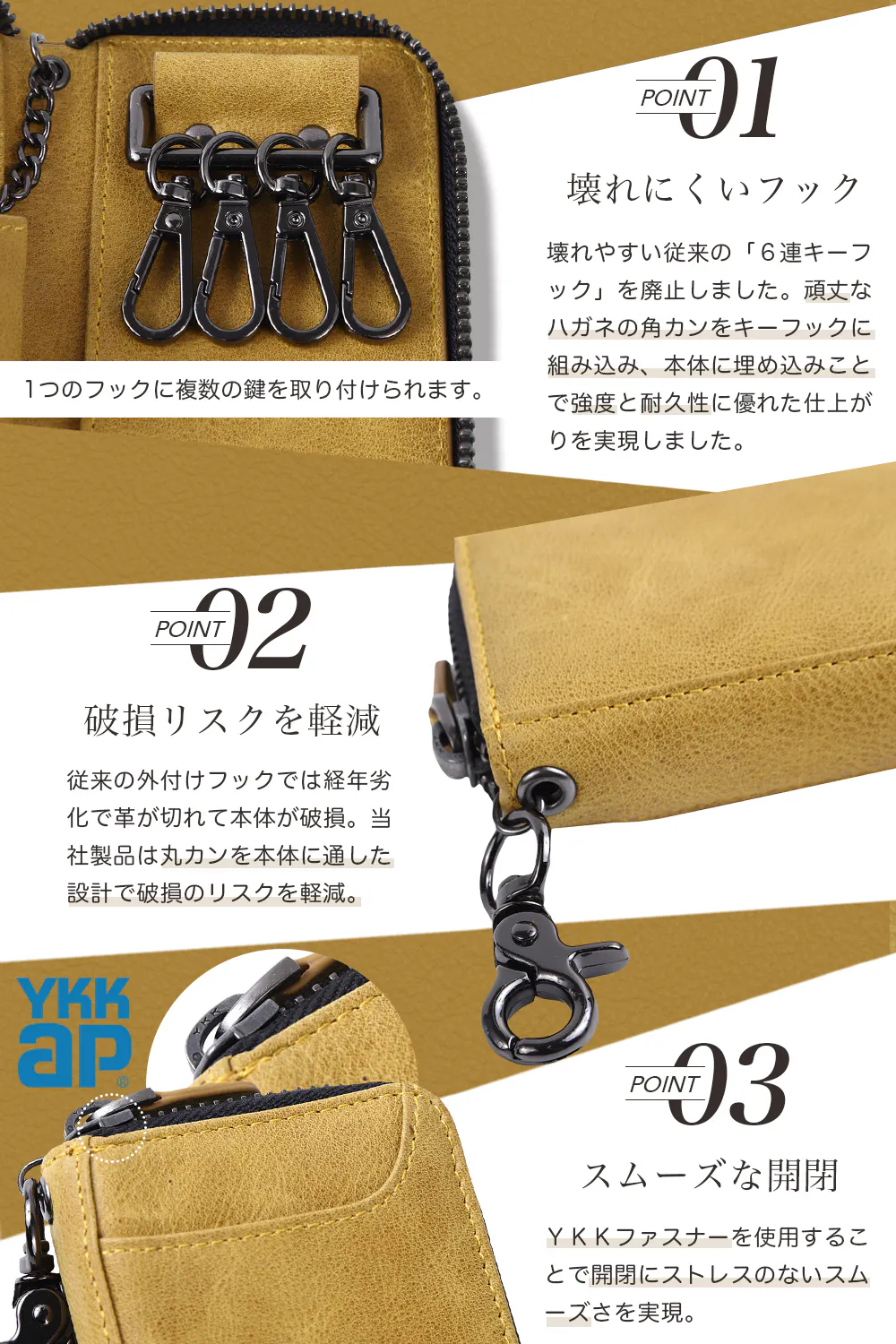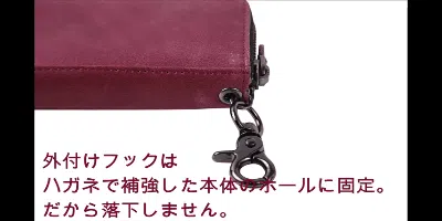 ①「6連キーフック」の使用を止め、ハガネの丸カンを本革本体に埋め込んでいます。そして、ハガネのキーフック(ナスカン)をハガネの丸カンに組み込むことで、「本革本体が破れない限りキーフックが外れない」設計になっています。 【【意匠権を特許庁に申請中です】】