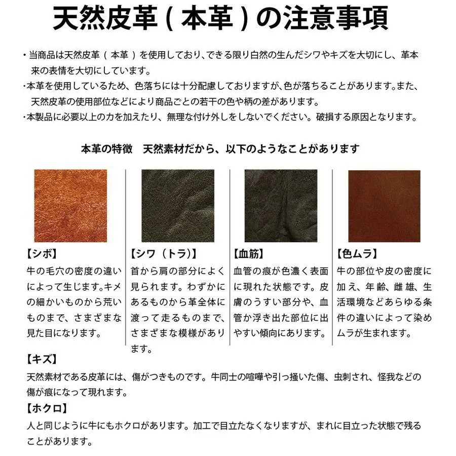 当製品の本革は、牛の革(牛のひふ・肌)です。人間の肌も微量なニオイがあるように、牛の肌にもニオイがあります。生き物の肌を製品に使っている以上、「無臭の本革製品」が存在しないことをご理解ください。