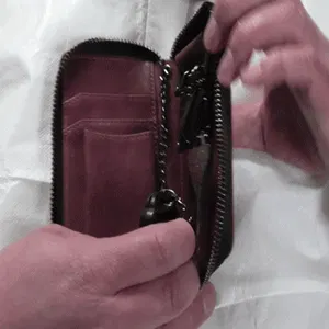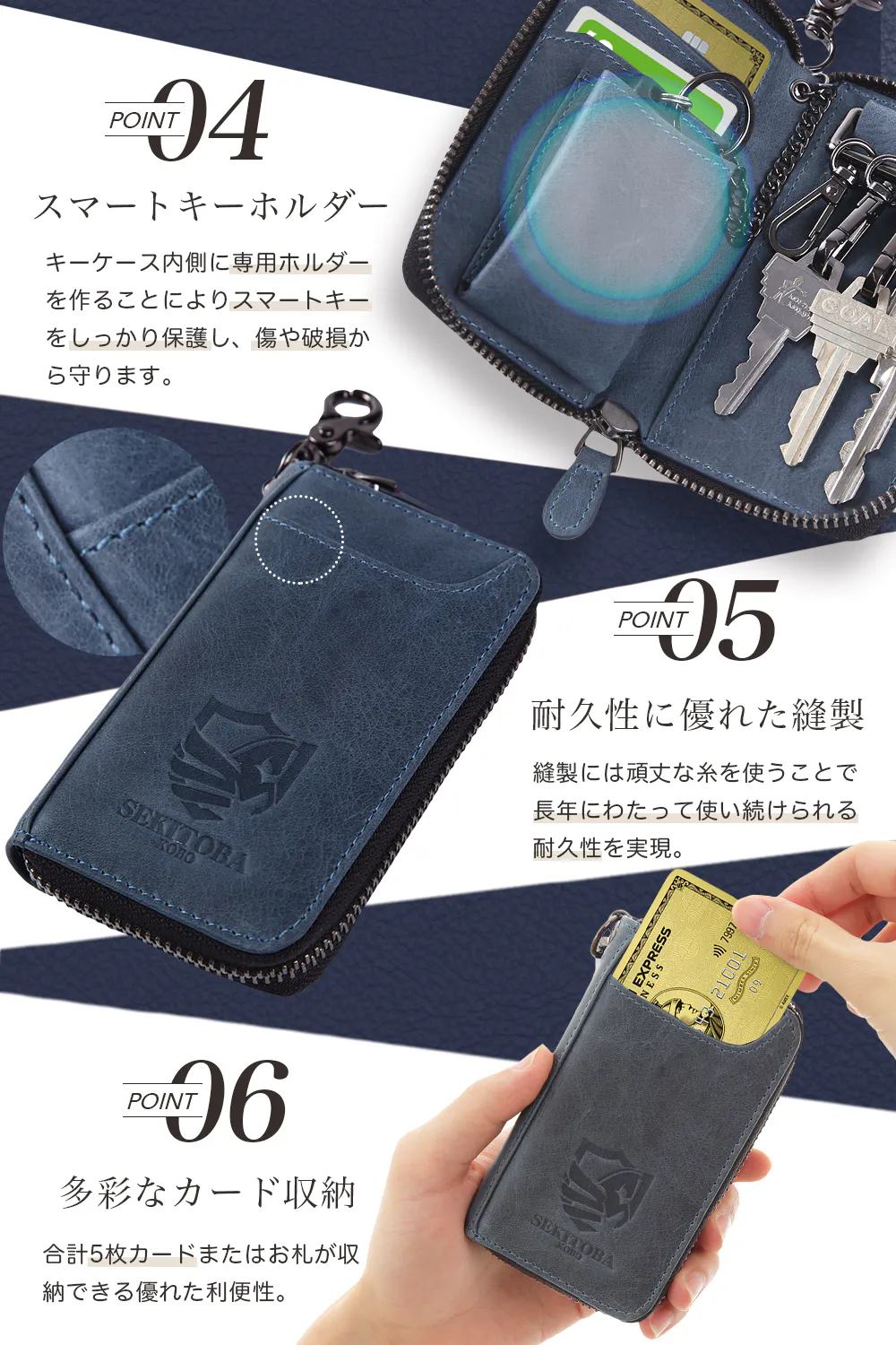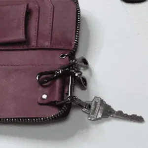 ④自動車用のスマートキーを結ぶチェーンとスマートキーをしまうポケットが付いています。ポケットにしまうことで、スマートキーが壊れたり、傷ついたりするのを防いでいます。