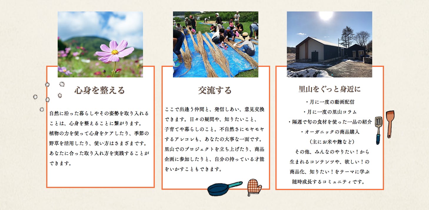 オンラインを活用したコミュニティに参加し、どこからでも里山にアクセスし、その魅力やその叡智に触れ、実際に農作物を購入することも可能。自分の食卓と顔が見えるオーガニックファーマーが共に里山を未来につなぎます。