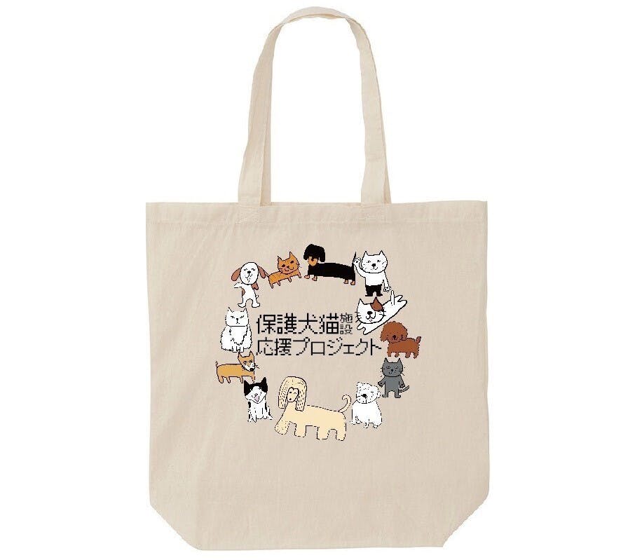 かわいい犬猫のイラストに、保護犬猫施設応援プロジェクトの文字入りです。