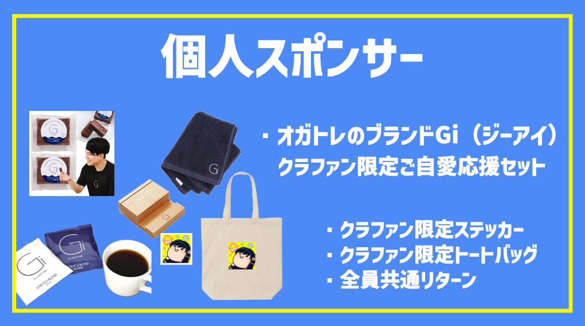 ●1.2万円リターン例:オガトレ発のブランドGi(ジーアイ)のタオル、コーヒー、プロテインバー、スタンドに加え、限定トートバッグ、限定ステッカーのセットです。*原材料及び添加物等の食品表示はお届け商品のラベルに表記されます